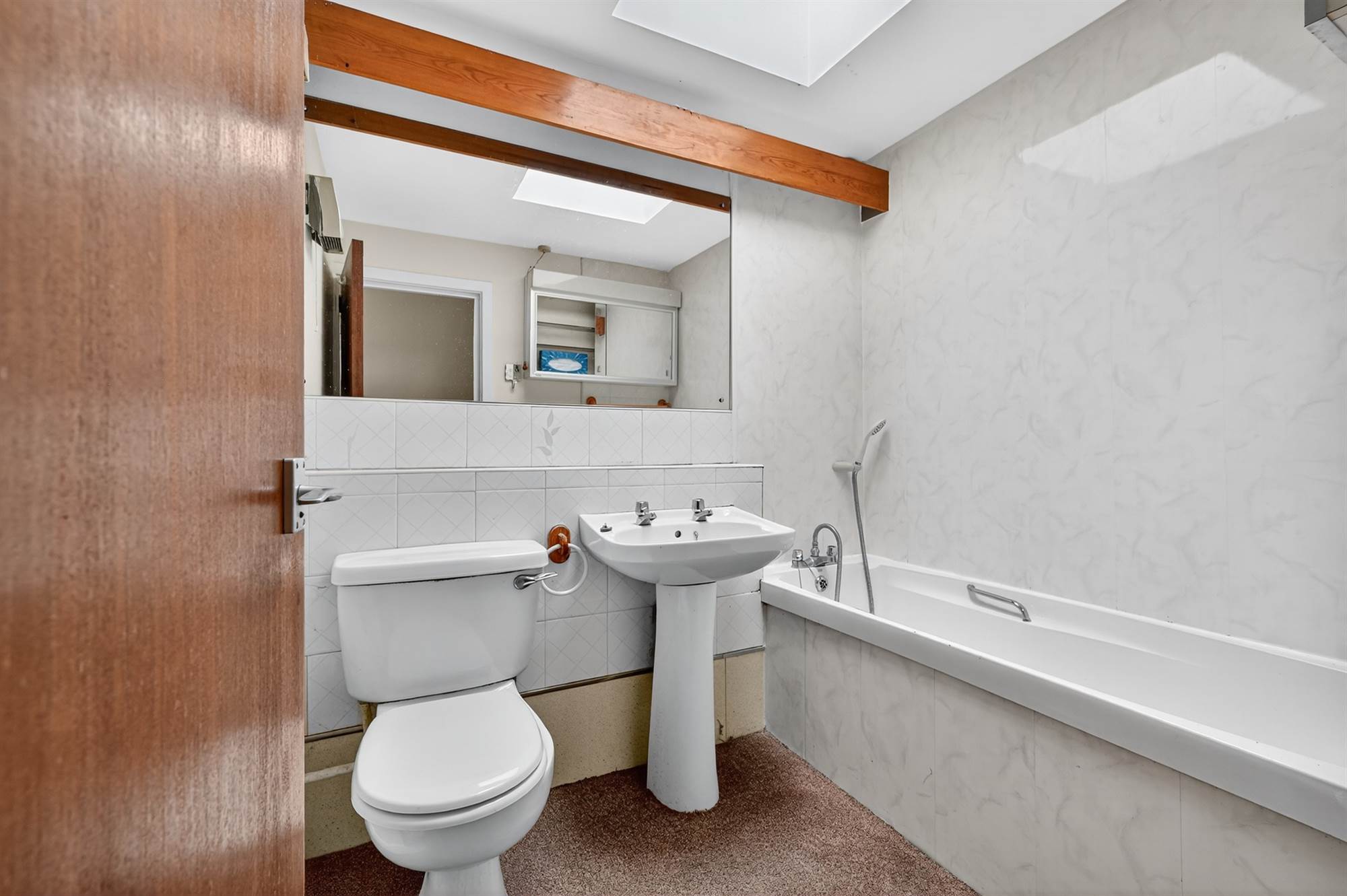 White suite comprising low flush wc, pedestal wash hand basin, panelled bath, part sheeted walls.