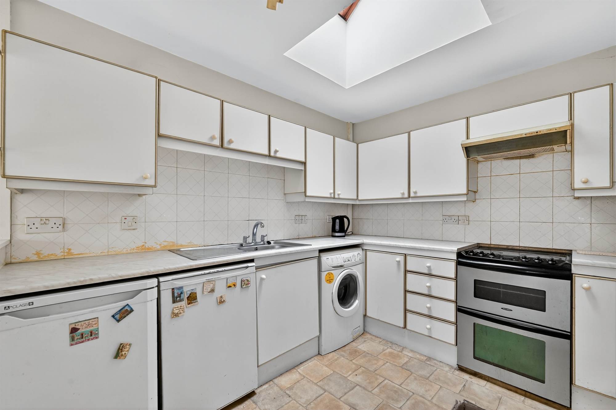 (at widest points). Range of high and low level units, work surfaces, single drainer stainless steel sink unit, space for cooker, space for fridge freezer, space for cooker, part tiled walls, Velux window.