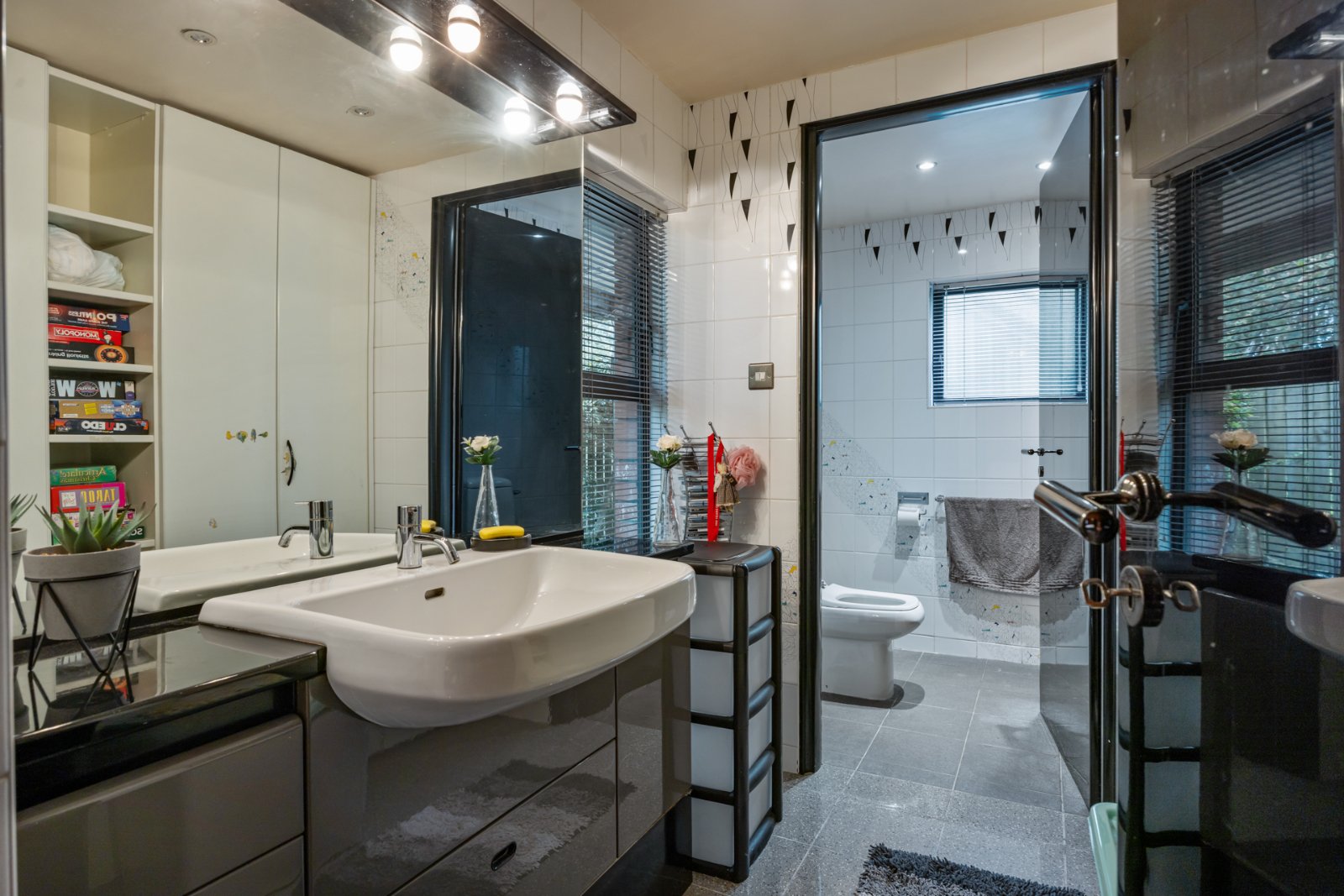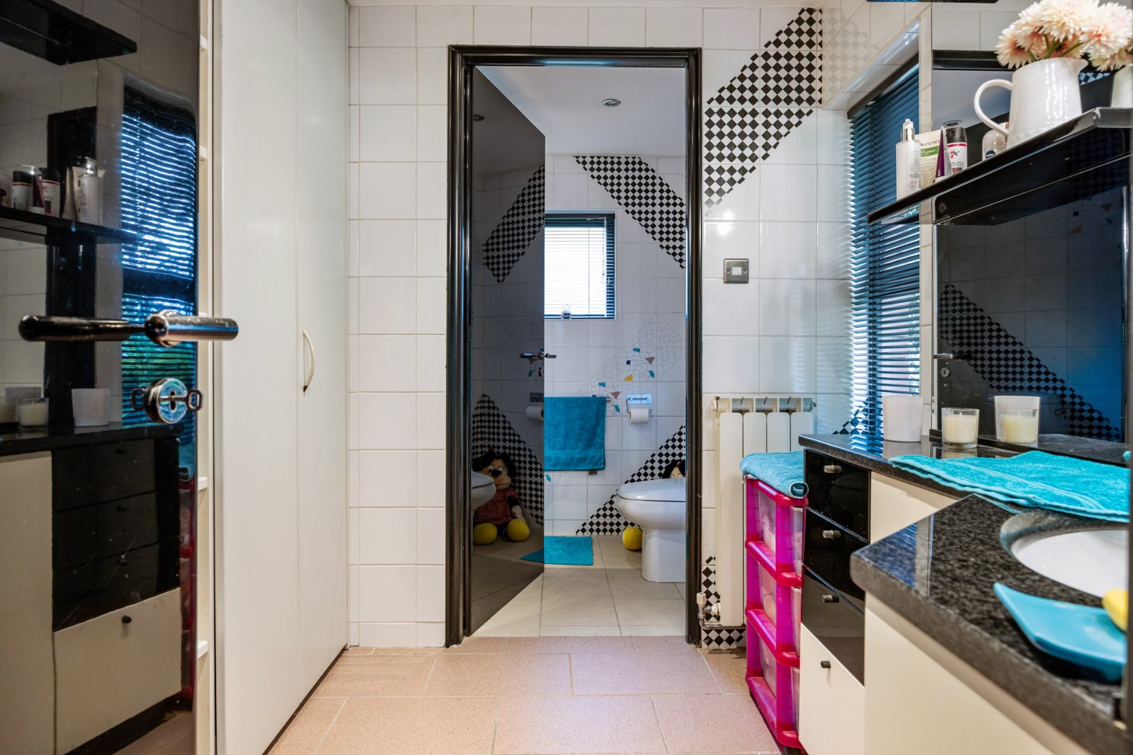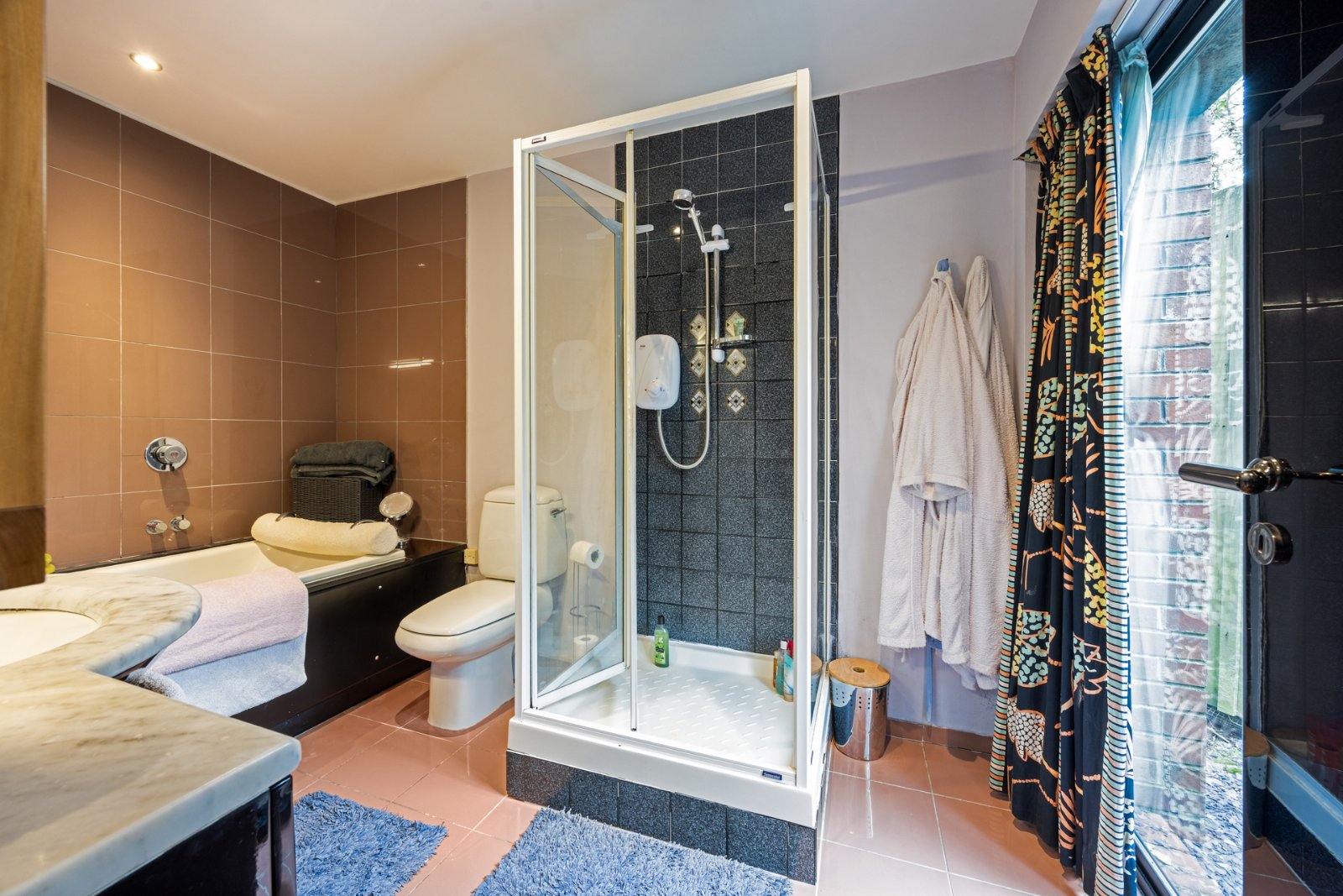 Comprising jacuzzi bath, Aqualisa shower, wash hand basin with marble surfaces and storage below, separate shower with Mira vigour shower low flush w/c, part tiled walls, extractor fan, recessed spotlights, tiled floor, sliding door access to the rear gardens.