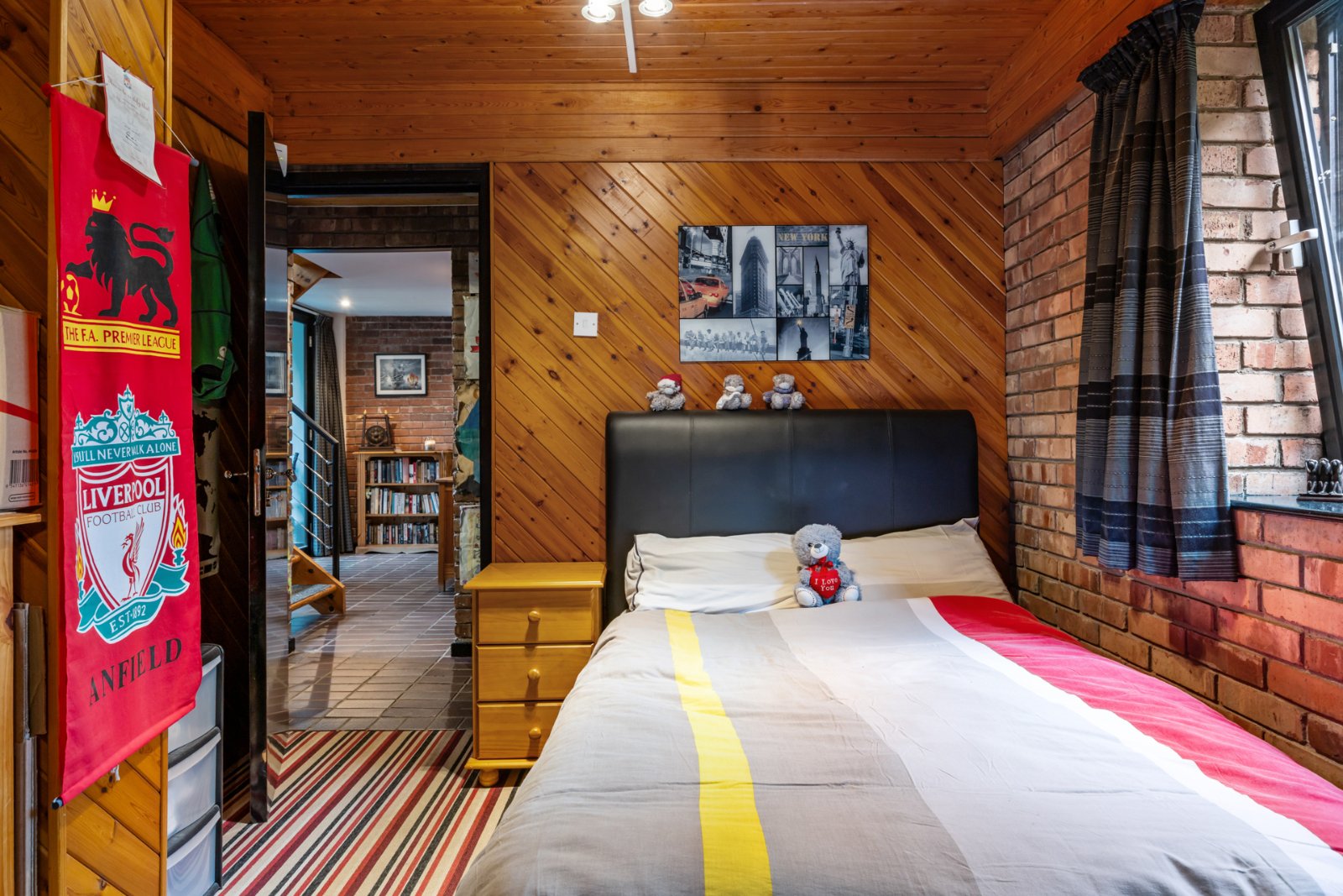 Part wood panelled and exposed brick walls, wood panelled ceiling.