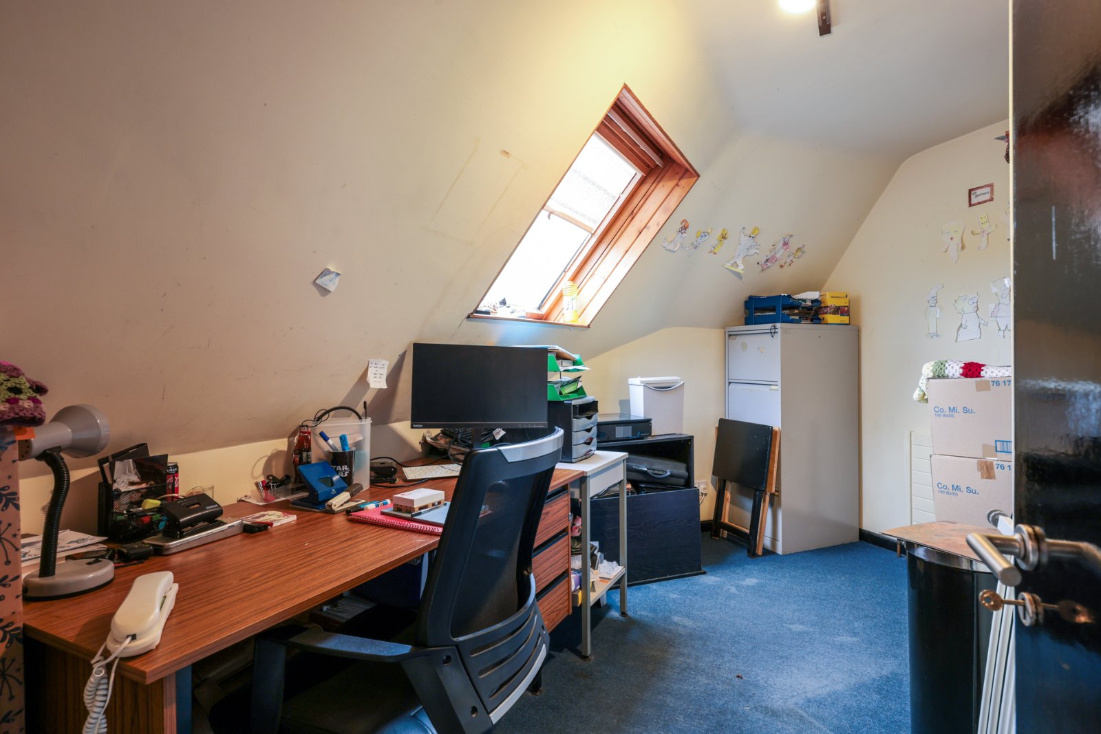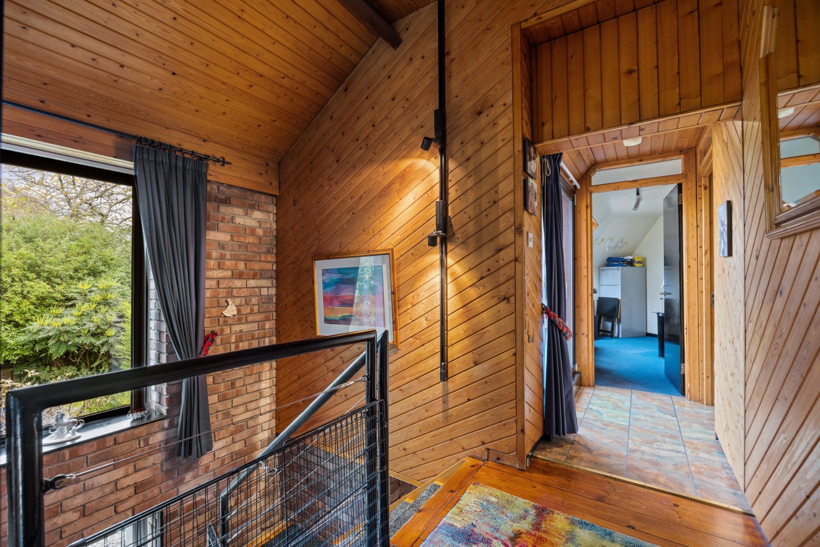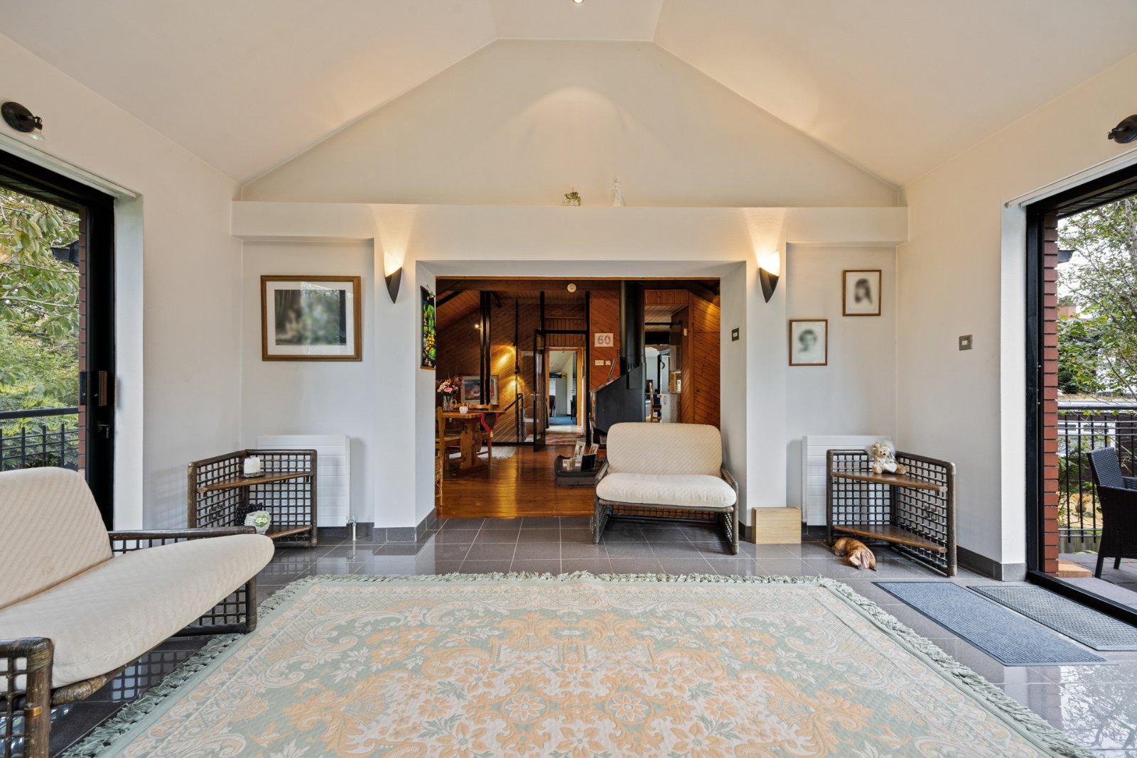Wood burner, timber flooring, built in storage, wood panelled ceiling and original roof beams.