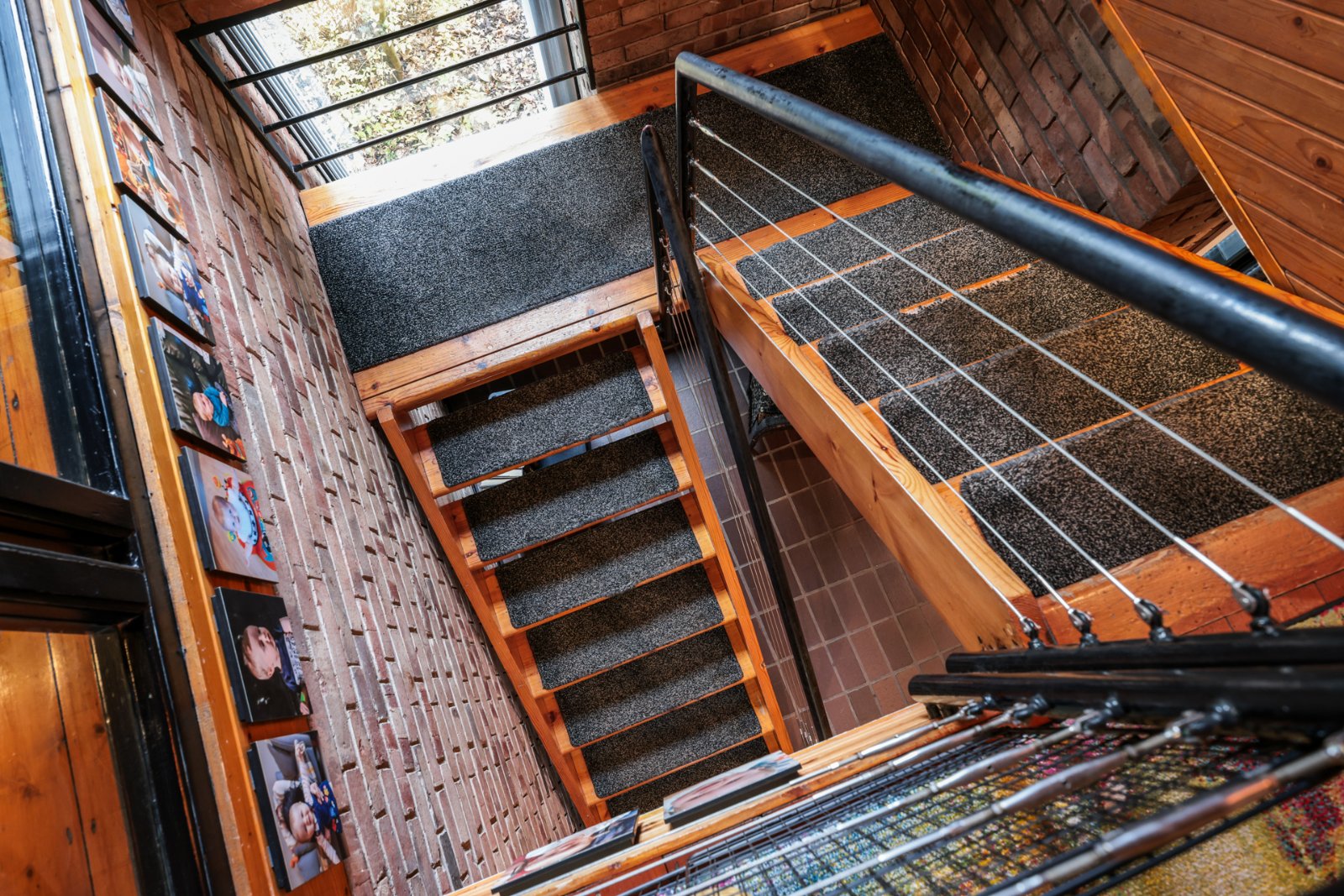 Exposed brick and wood panelled walls, wood panelled ceiling.