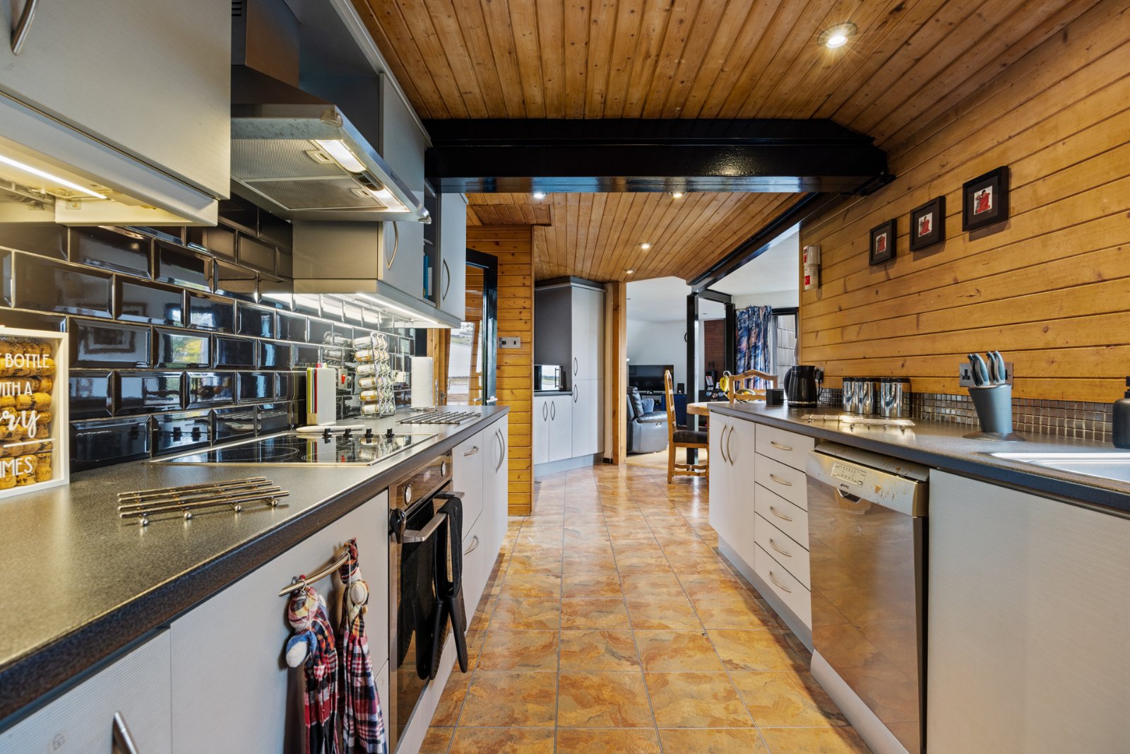 Range of high and low level units, single drainer 1 1/2 bowl sink unit with mixer taps, Formica work surfaces, 4 ring hob with extractor fan and under oven, plumbed for dishwasher, Integrated fridge freezer, part tiled walls, part wood panelled walls and wood panelled ceiling, Amtico flooring