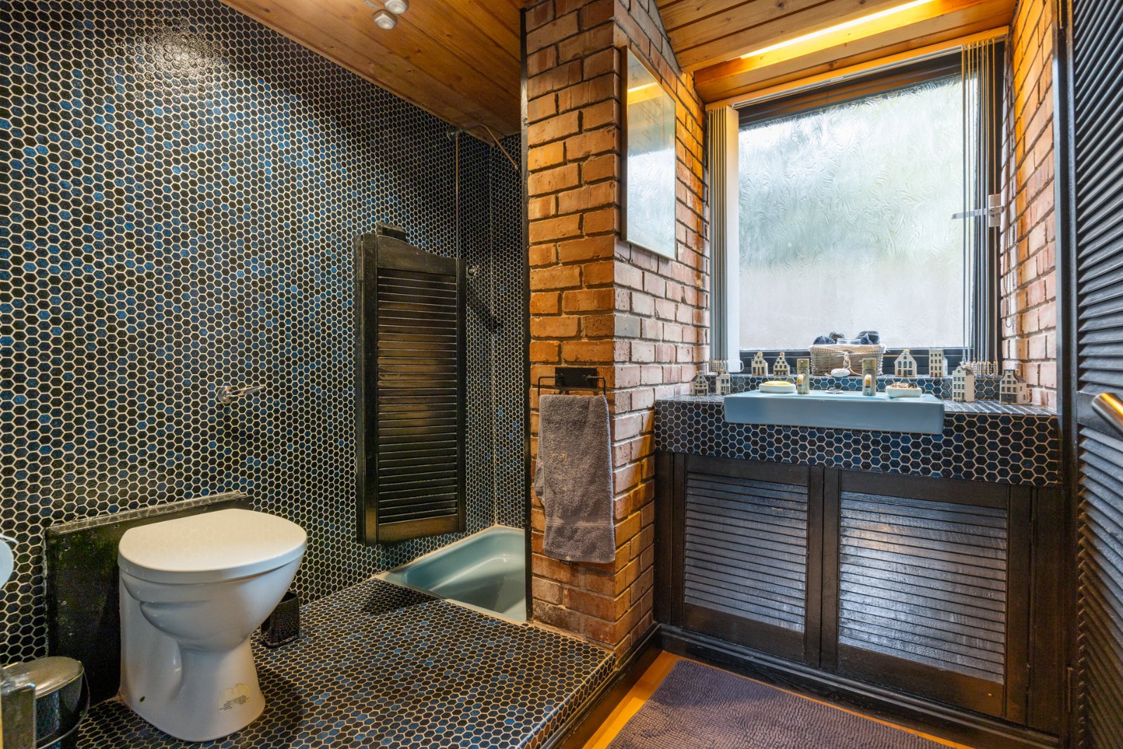Built-in shower with Triton shower, low flush w/c, fully tiled walls, tiled floor, recessed spotlights.