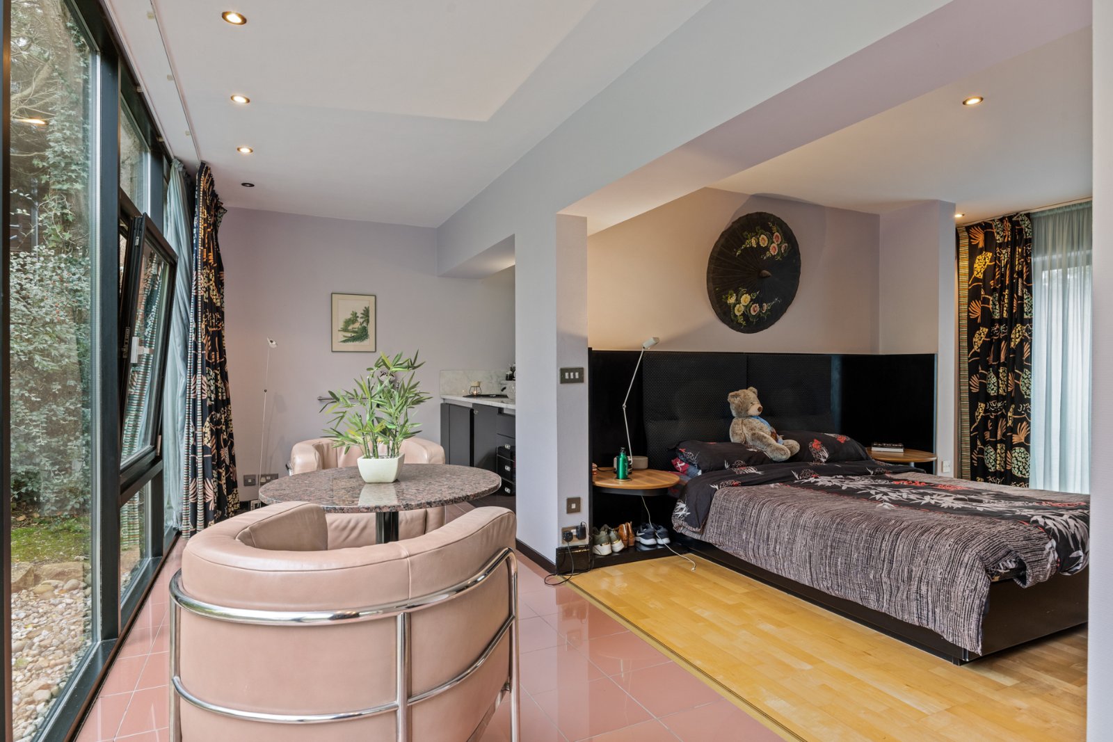 Vaulted Ceiling. Sliding doors to the left leading to a large private balcony with steps to the gardens.