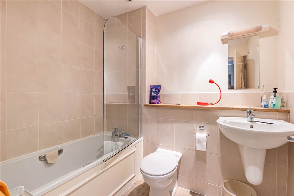 Three piece suite with low flush W/C, floating wash hand basin, panel bath with glass panel and shower attachment, part tiled walls and flooring.