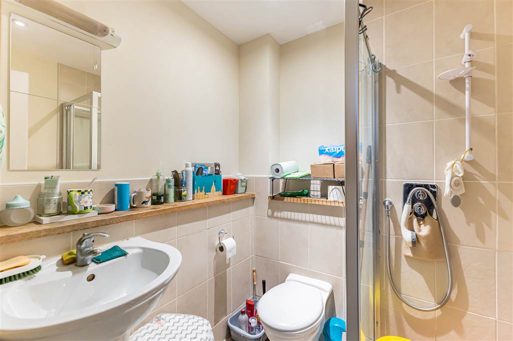 Three piece suite with low flush W/C, corner shower with sliding doors, wash hand basin, tiled walls and flooring, extractor fan.