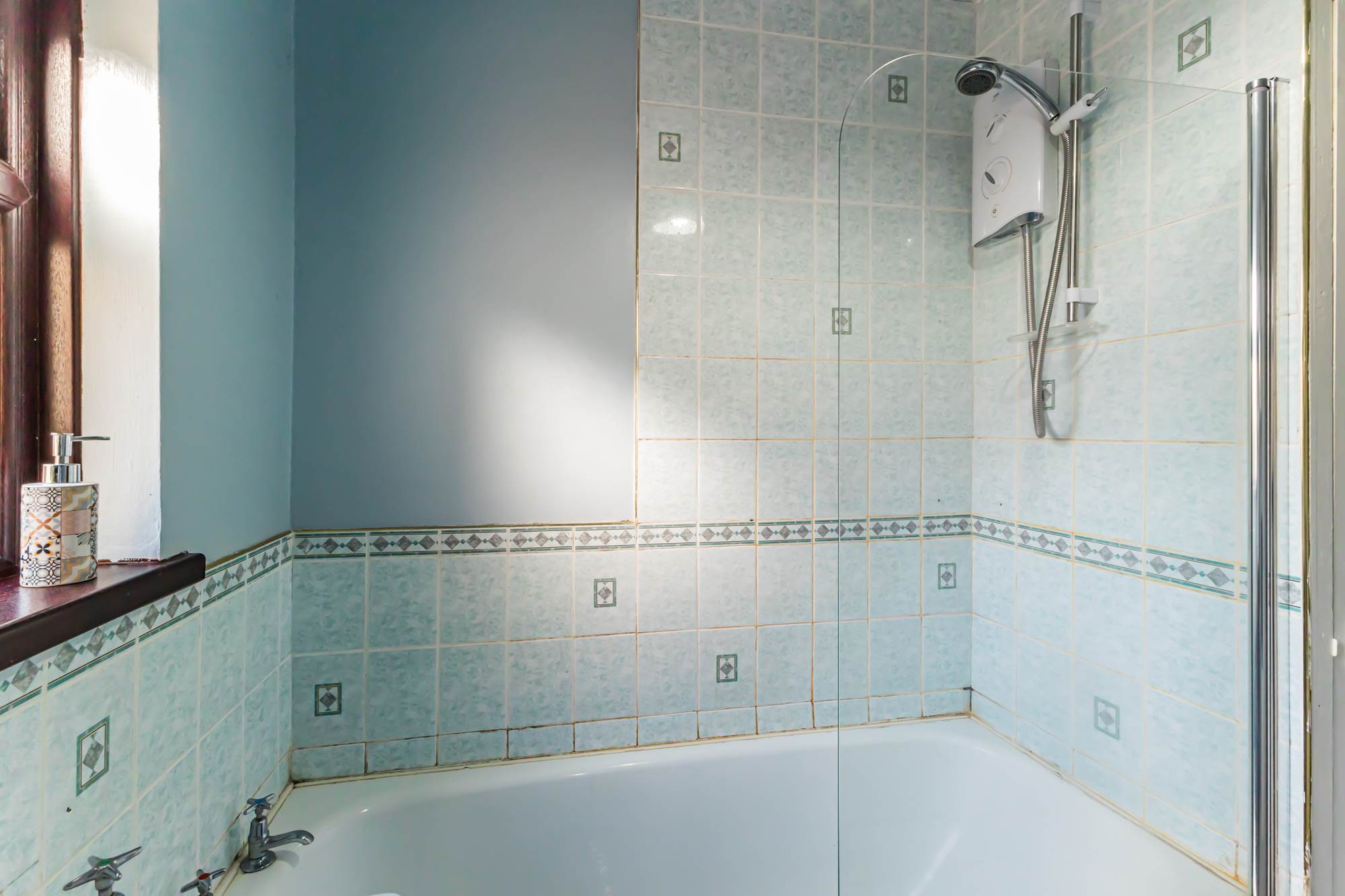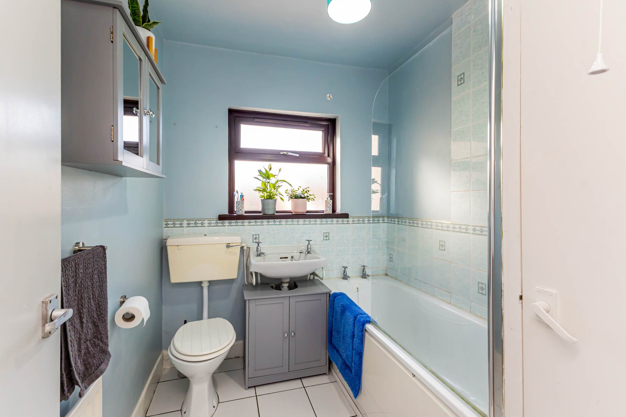 Panelled bath with shower over. Storage cupboard. Low flush wc, wash hand basin.