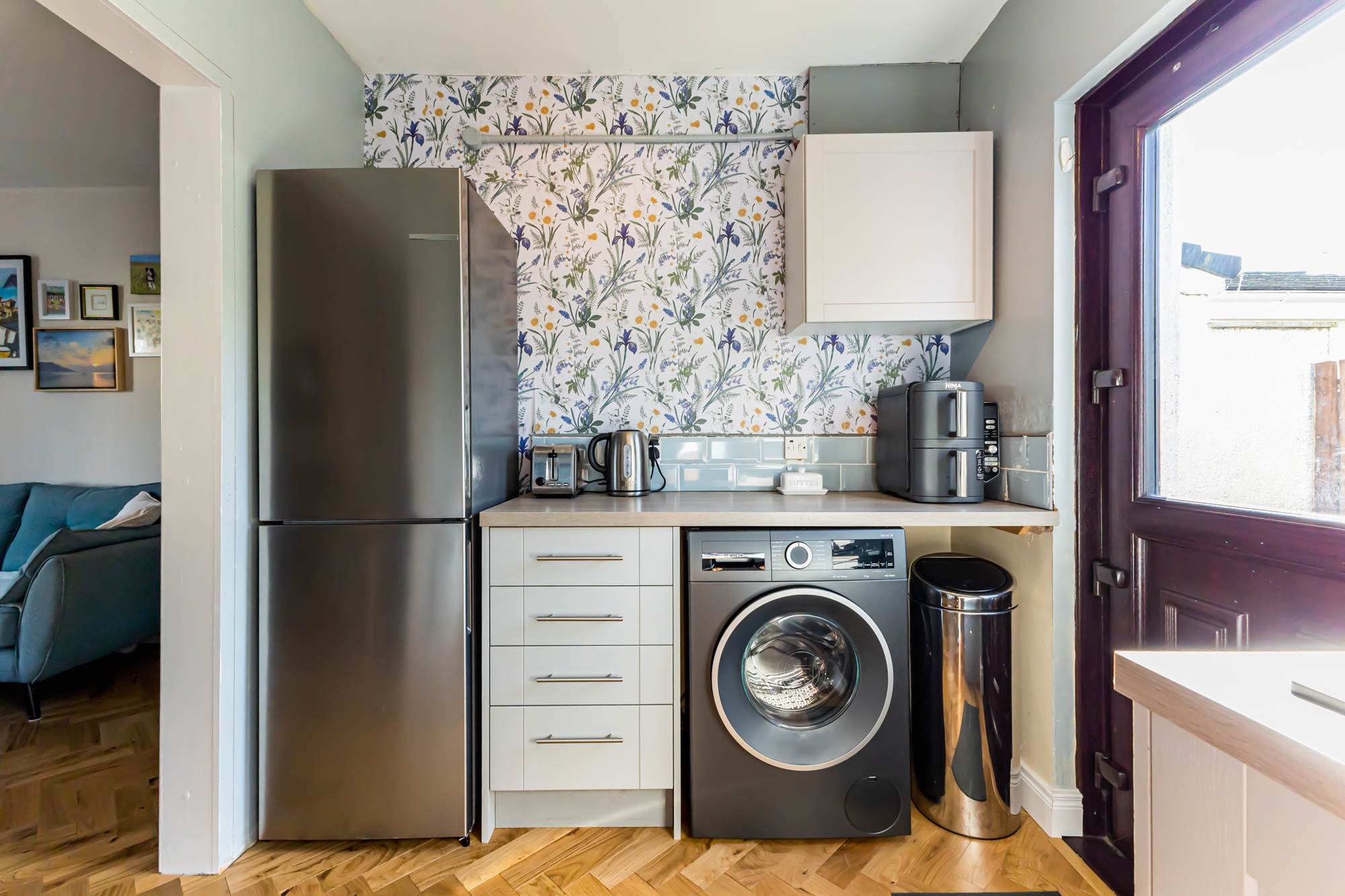 Single drainer sink unit with mixer tap, high and low level units. Four ring hob, electric underbench oven. Plumbed for washing machine.