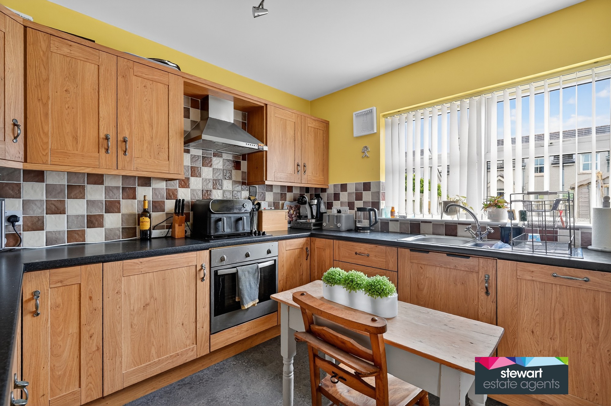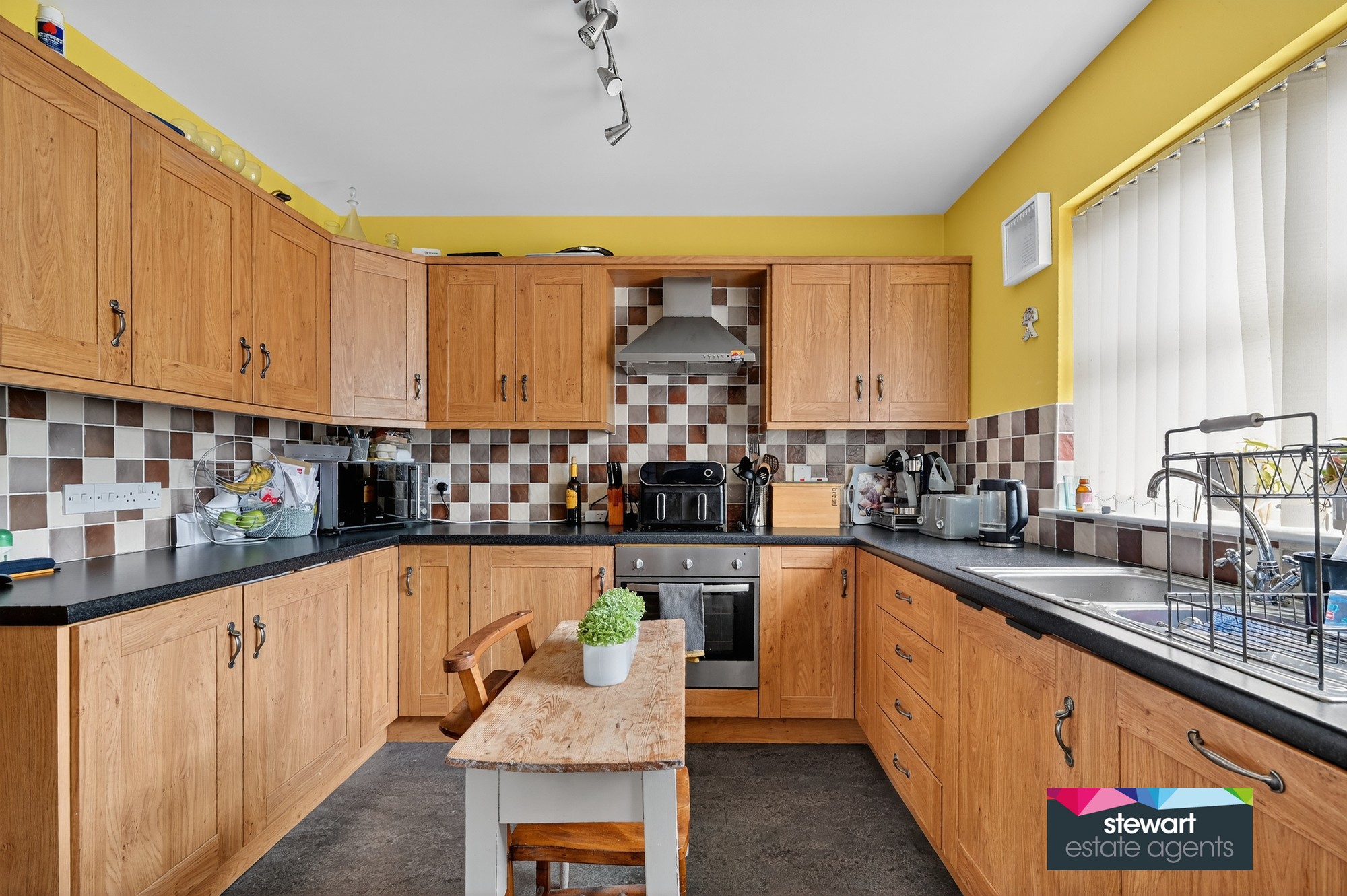 Modern style kitchen with a generous range of fitted high and low level units with a built in oven and inset hob, with an extractor fan above. Built in dish washer. Integrated fridge and integrated freezer