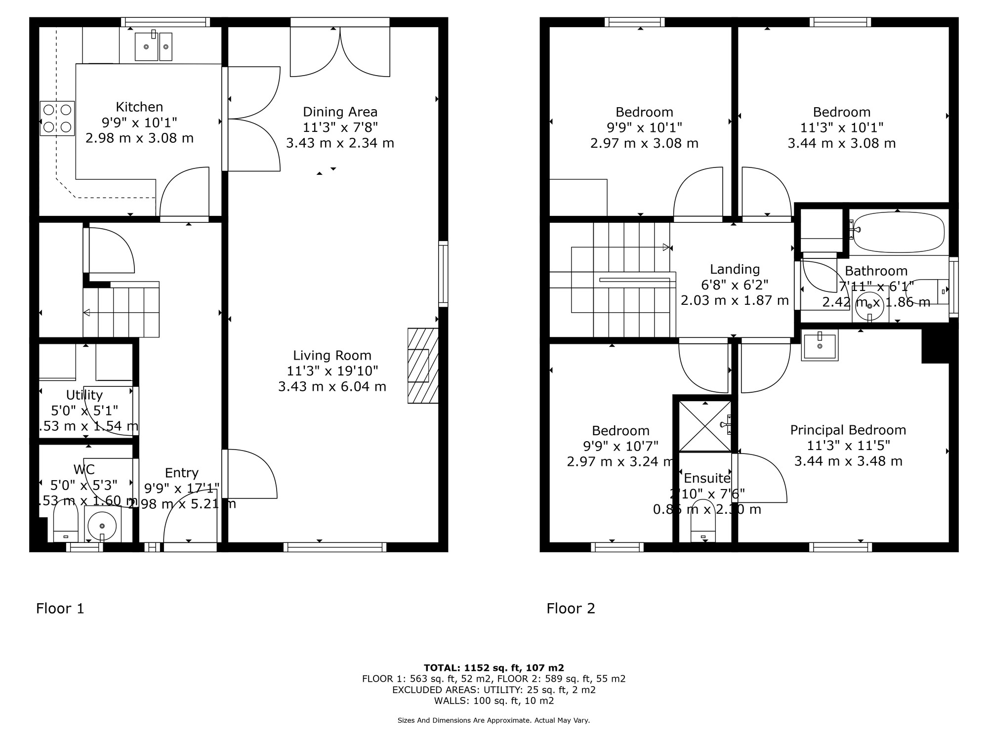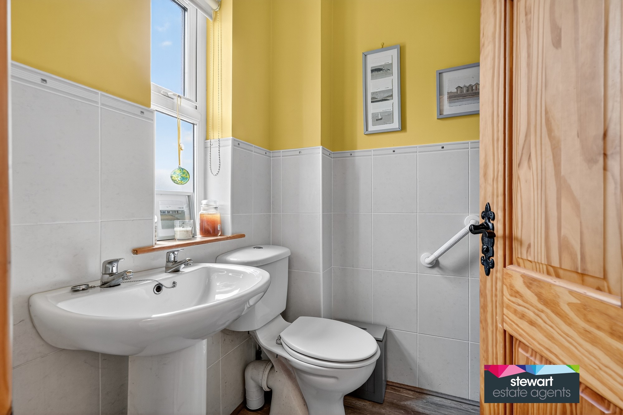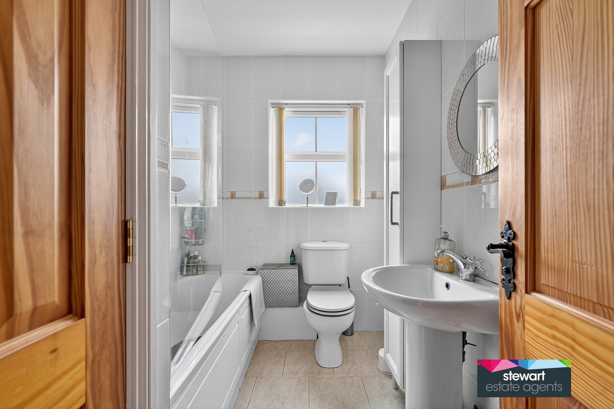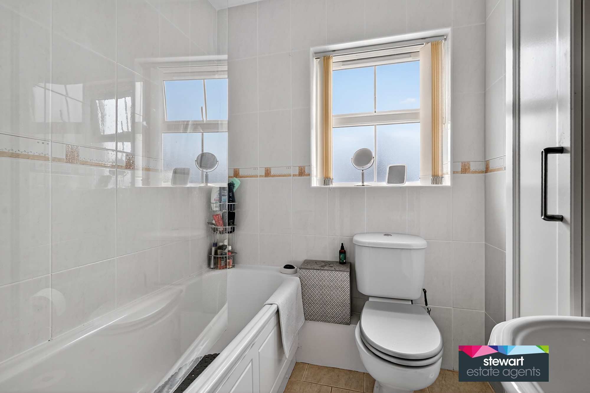 Bathroom on the first floor with modern and attractive white suite including a bath, WC and wash hand basin. Glass shower screen over bath with a fitted shower fitment