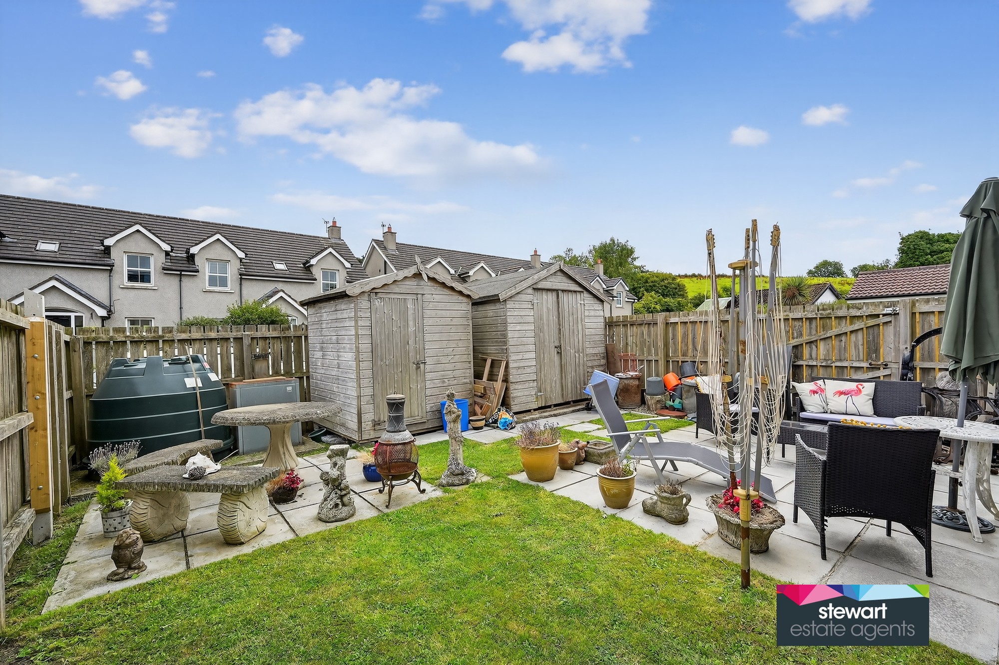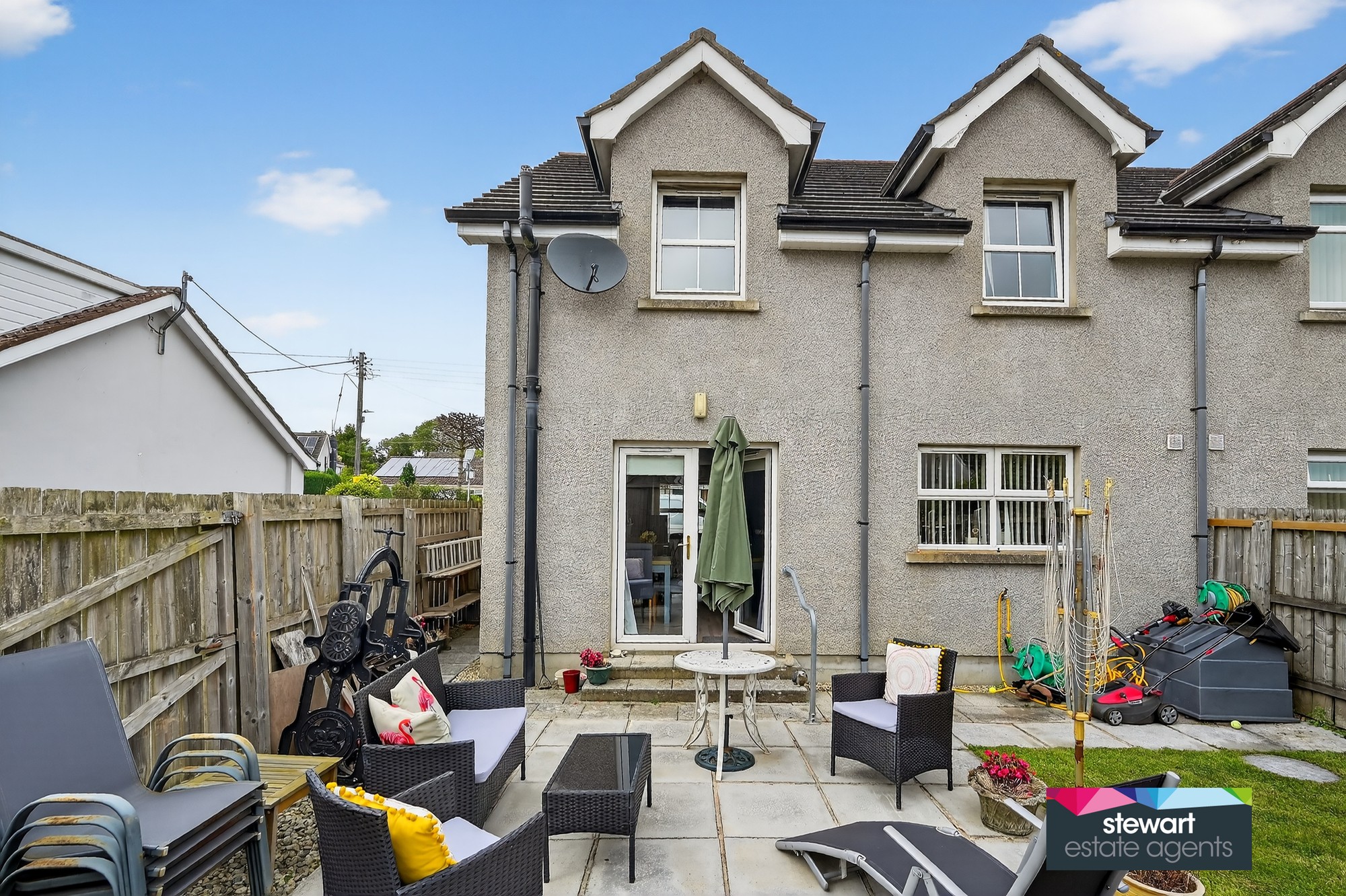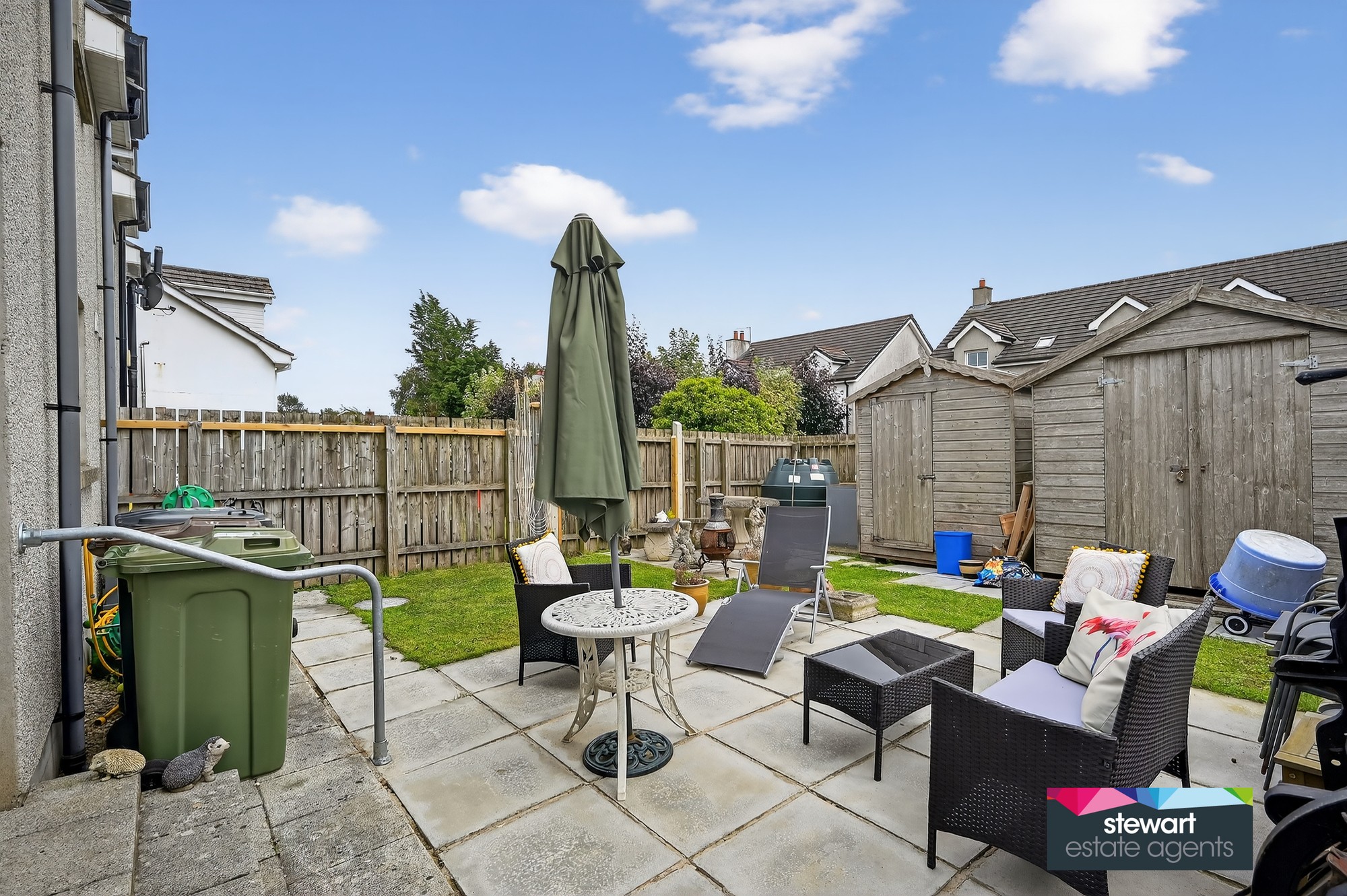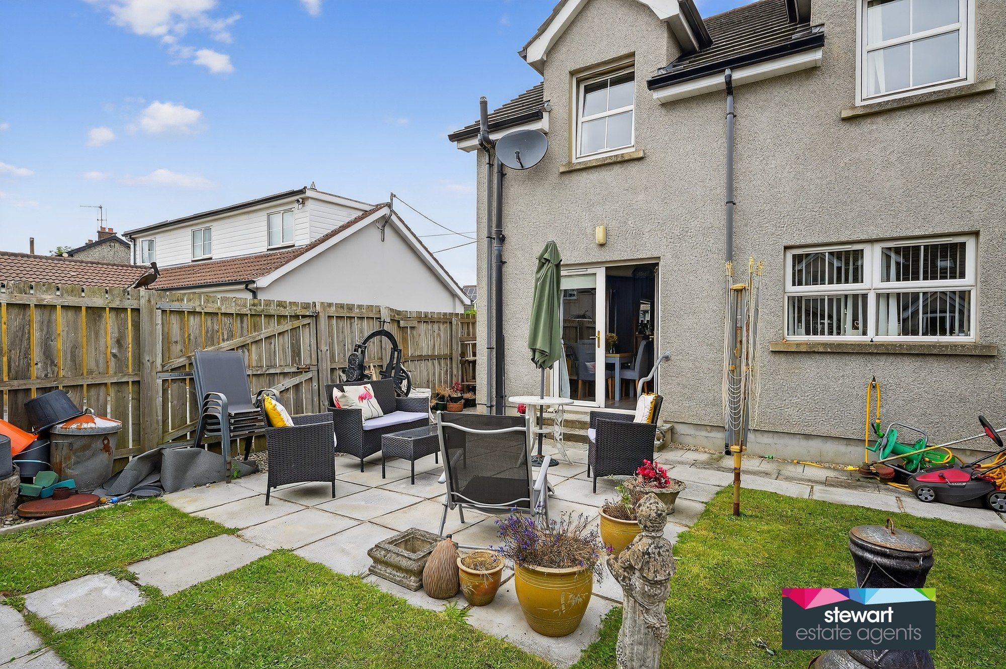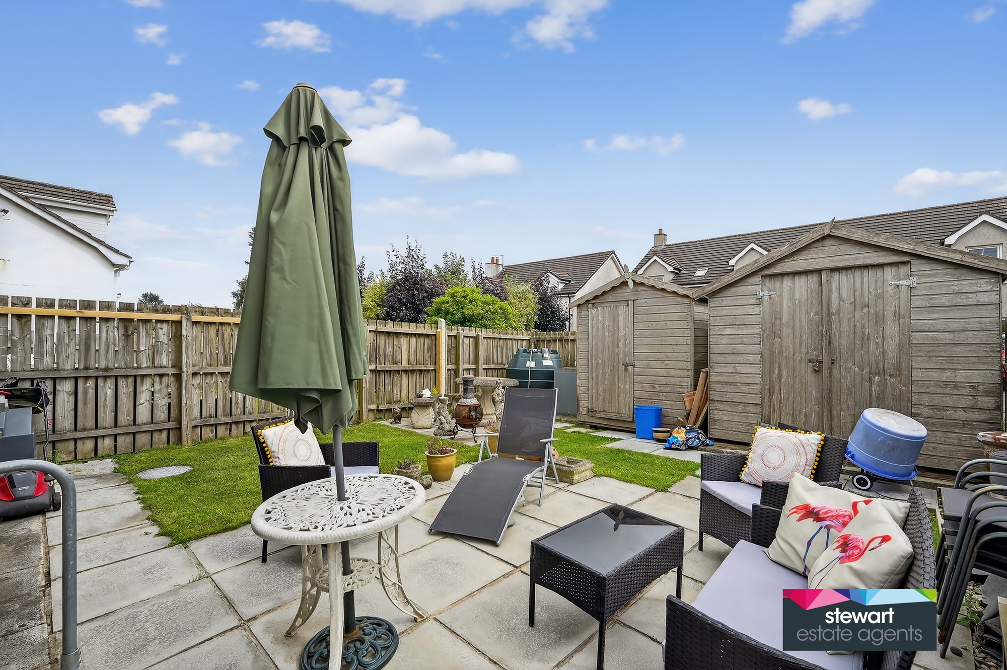 Enclosed rear garden area with neat lawns and patio area. Parking area at the front