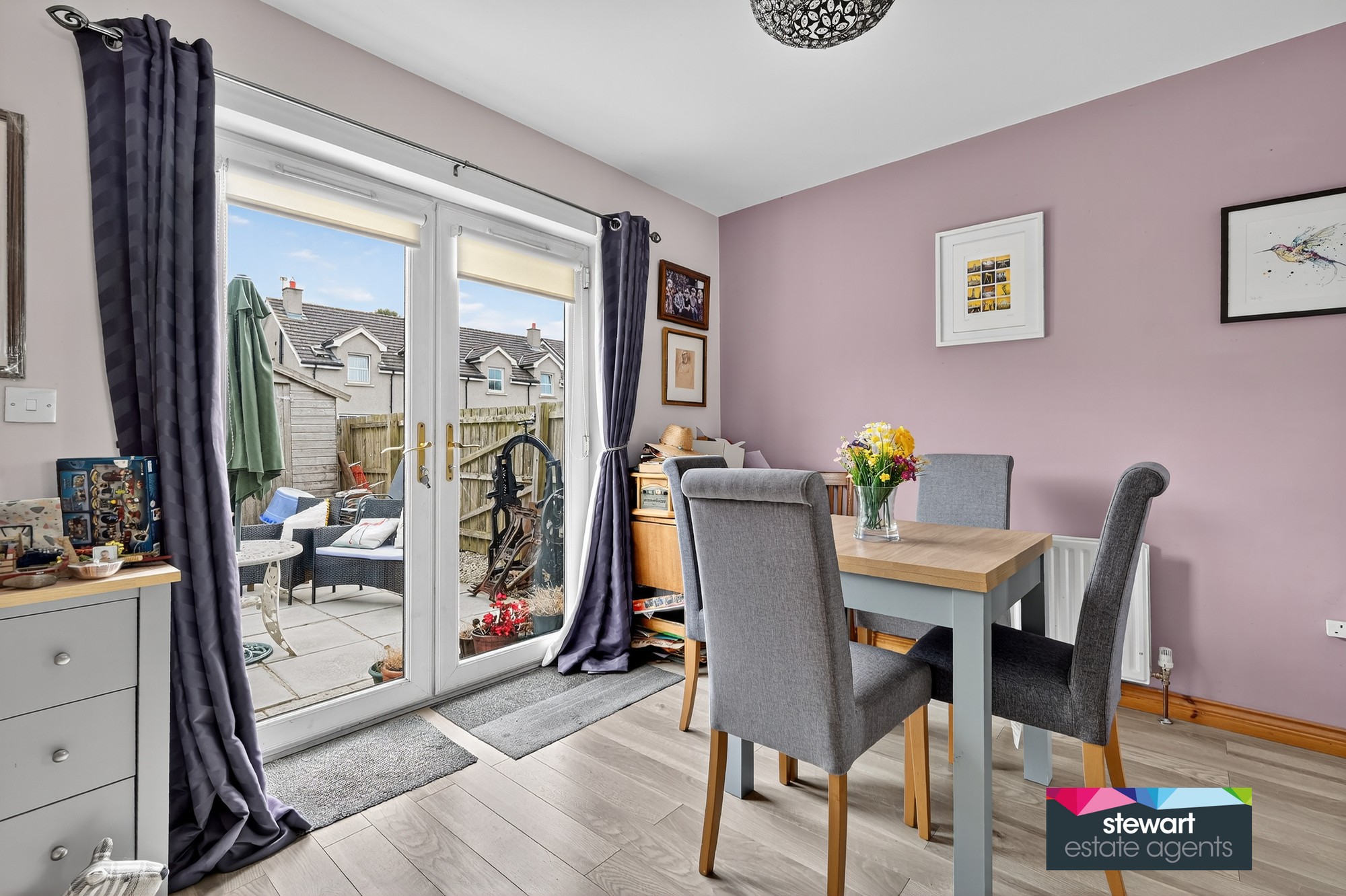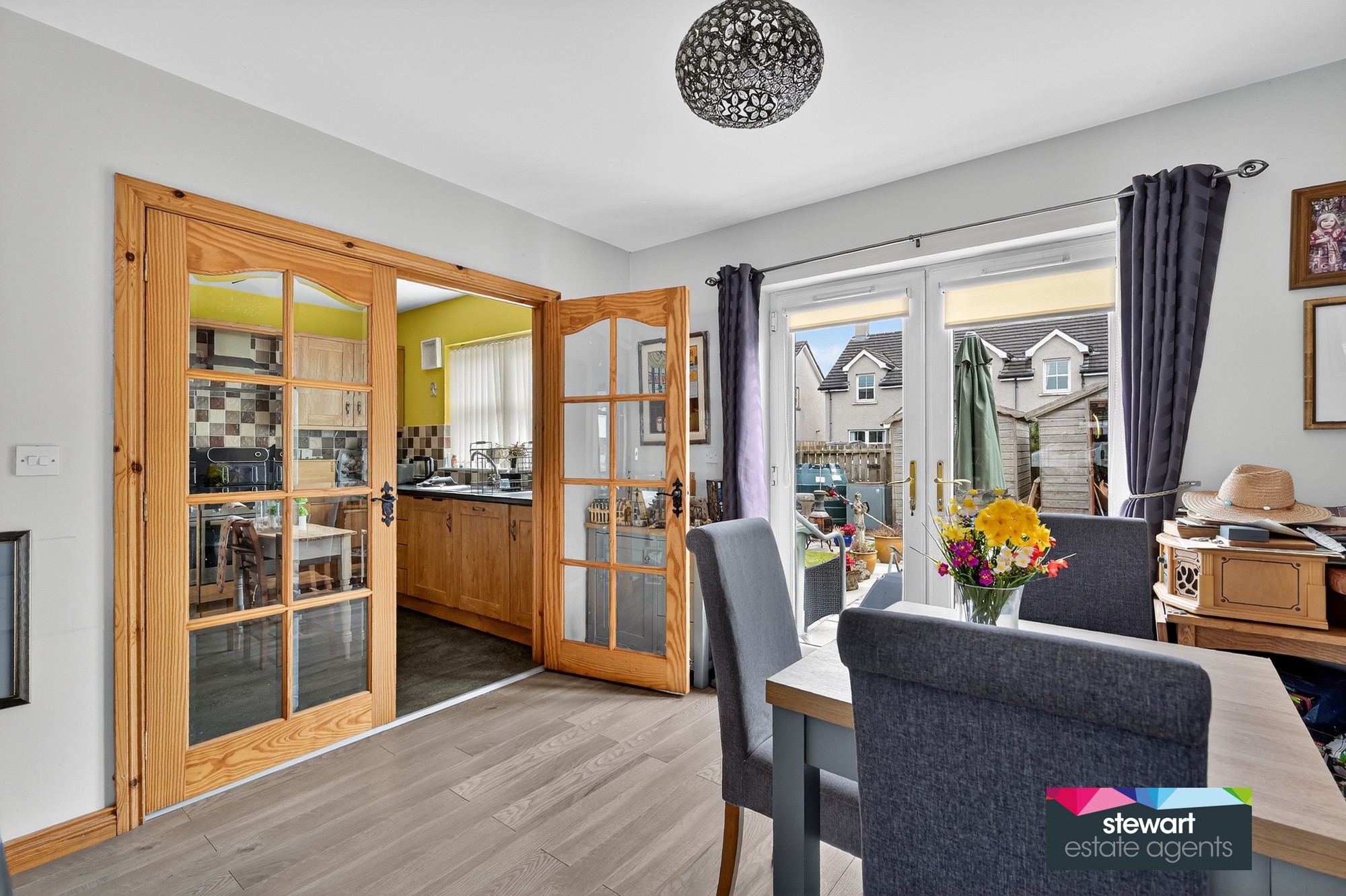 Open plan living room with dining area with an attractive fireplace and open fire. Glazed double doors leading through to the kitchen, patio doors leading to the rear gardens