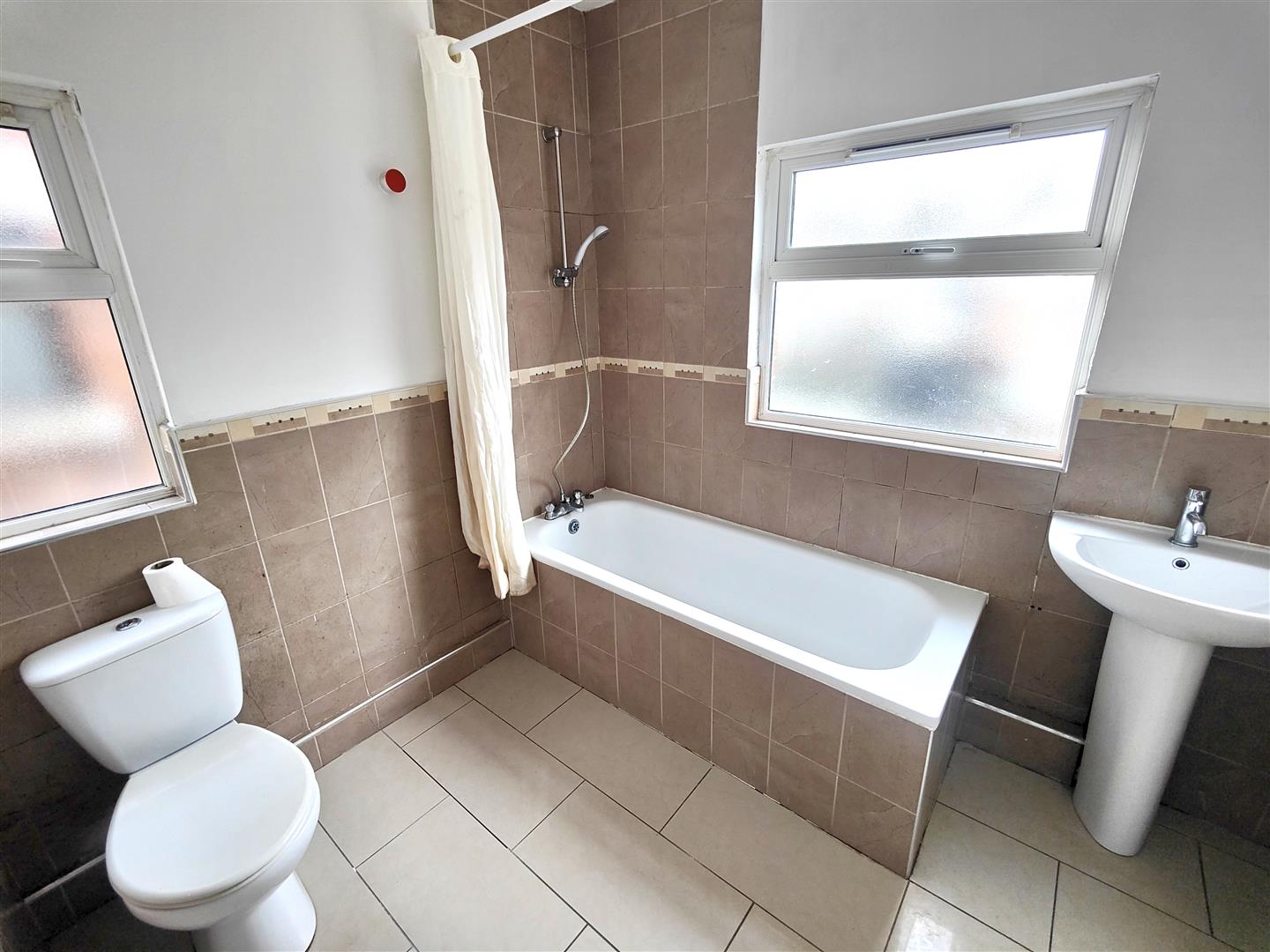 White suite comprising panelled bath, telephone handset shower, low flush wc, pedestal wash hand basin, partially tiled walls, panelled radiator.