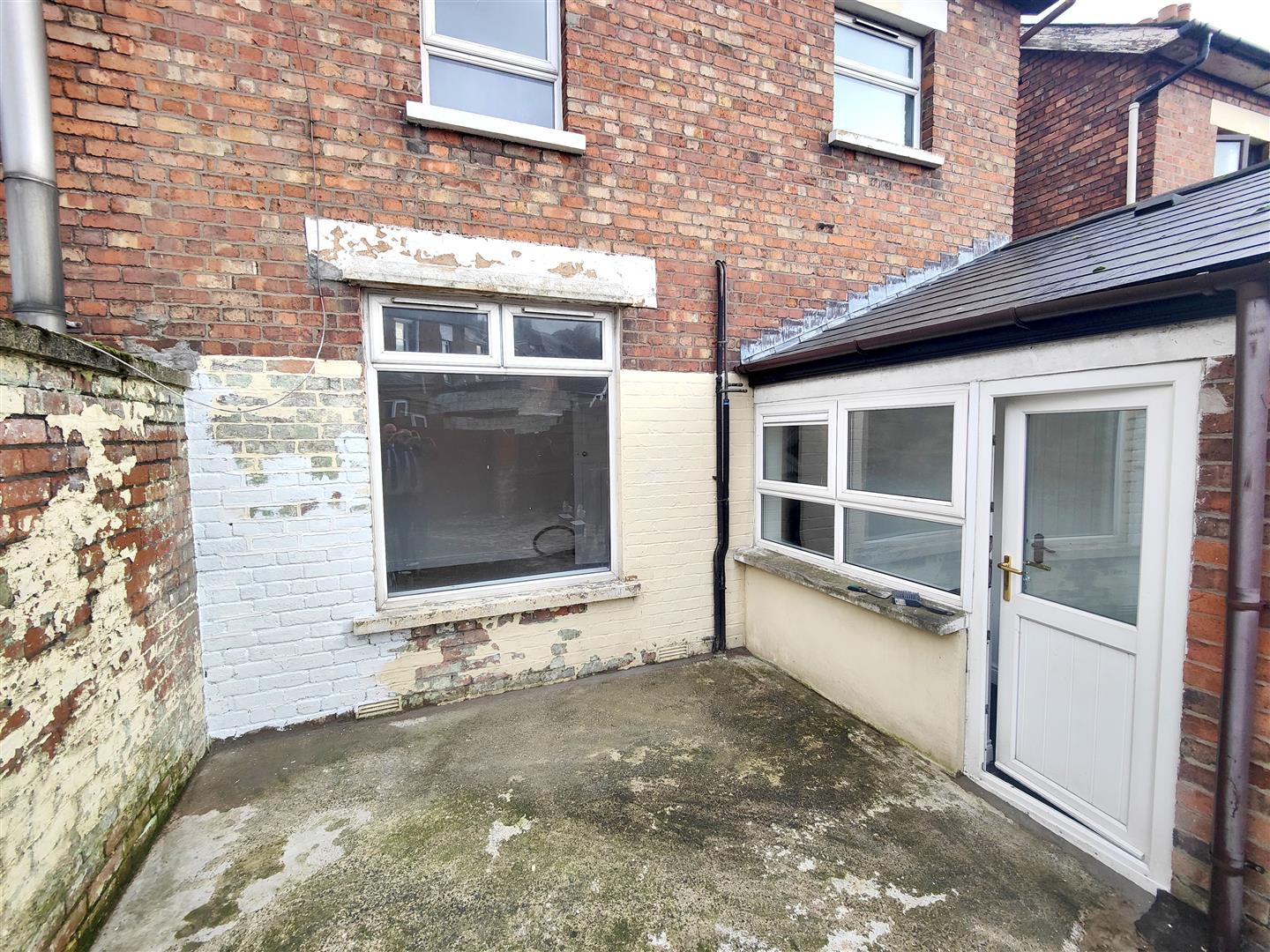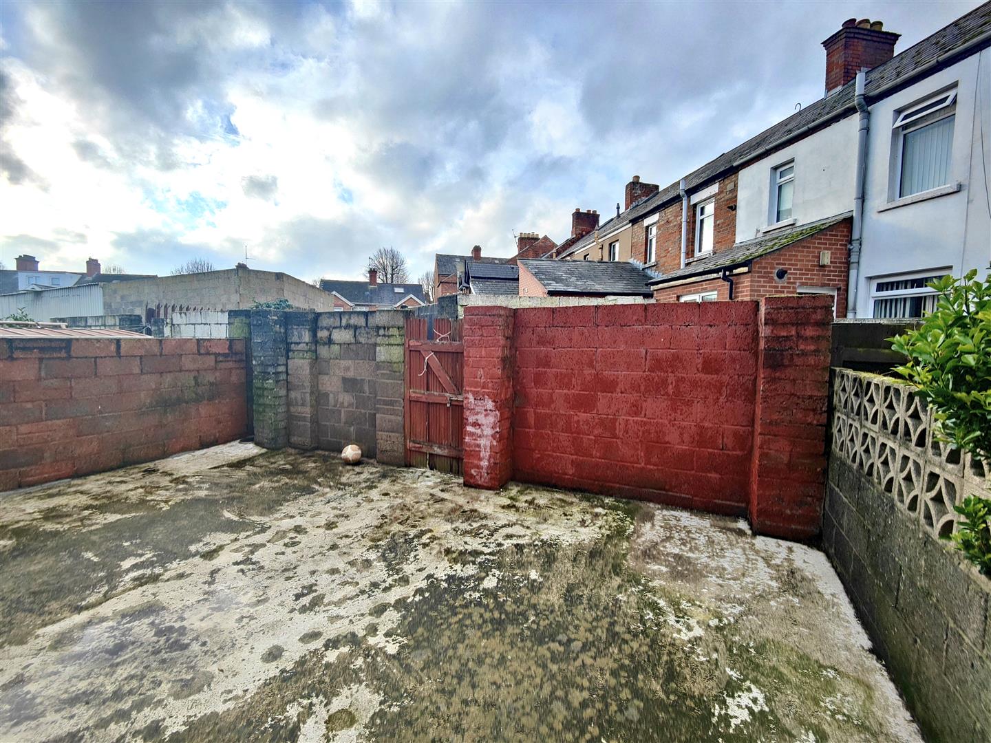 Hard landscaped city gardens front and rear in patio, side path.