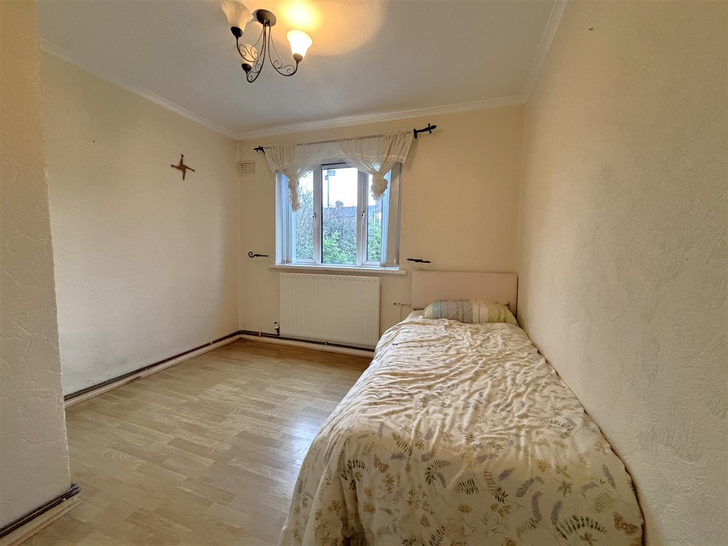 Wood laminate floor, double panelled radiator.
