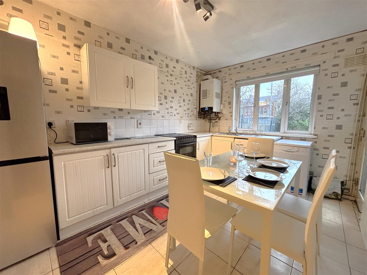 Single drainer stainless steel sink unit, extensive range of high and low level units, formica worktops, cooker space, fridge/freezer space, plumbed for washing machine, wall mounted gas boiler, panelled radiator, partly tiled walls, ceramic tiled floor.