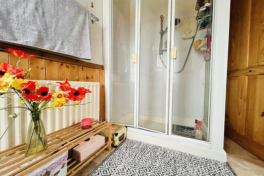 enclosed shower, white low flush WC, white hand basin and wood panelled bath.