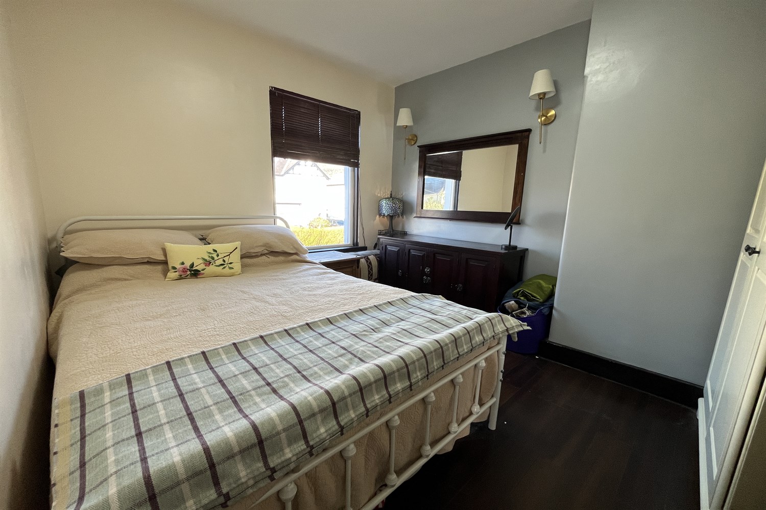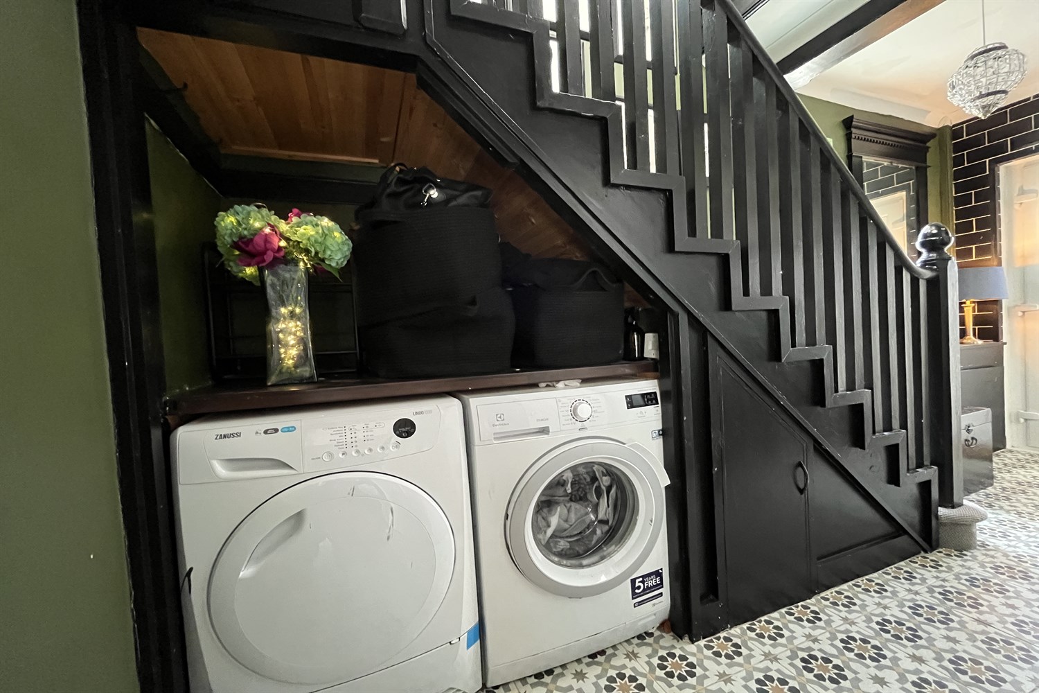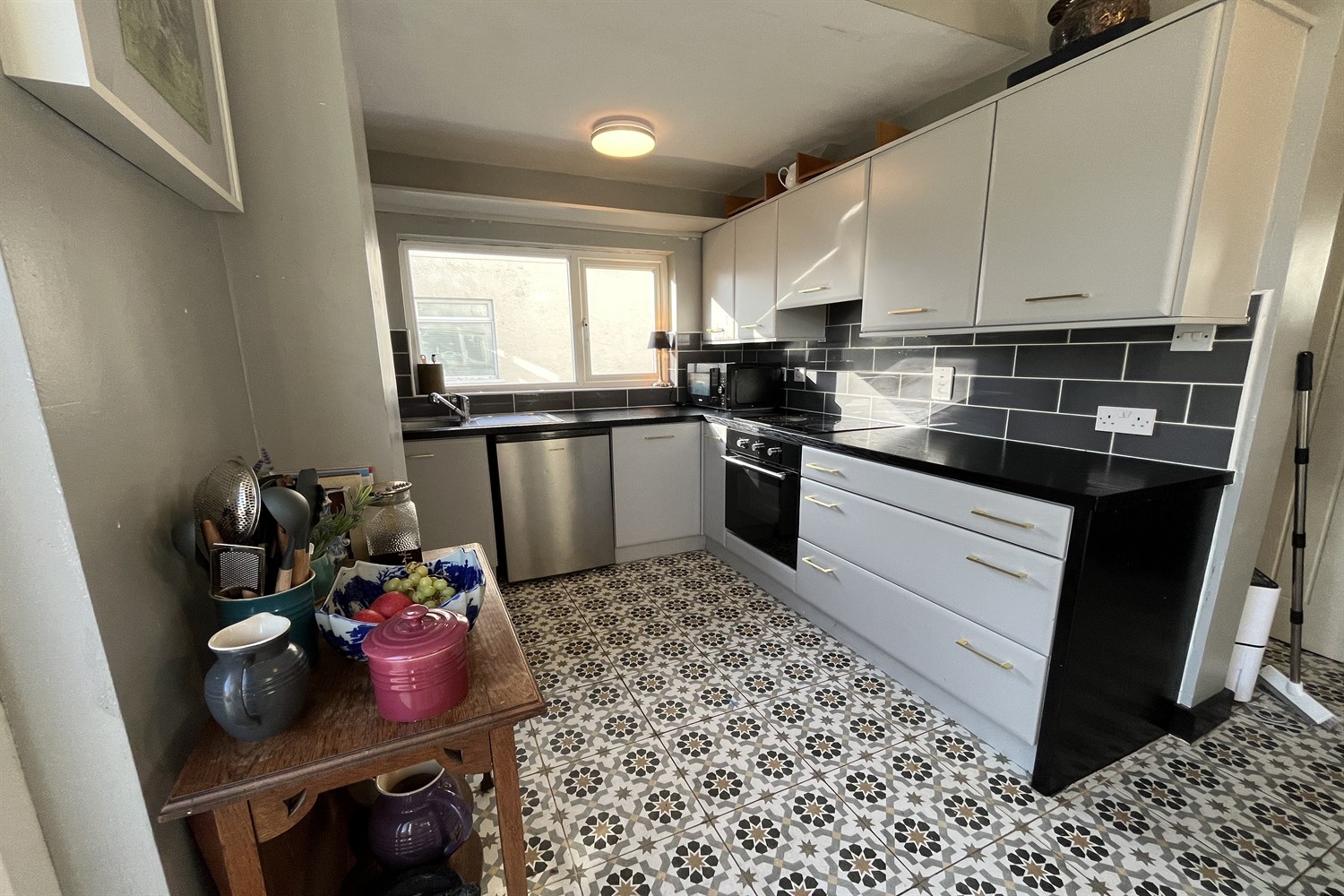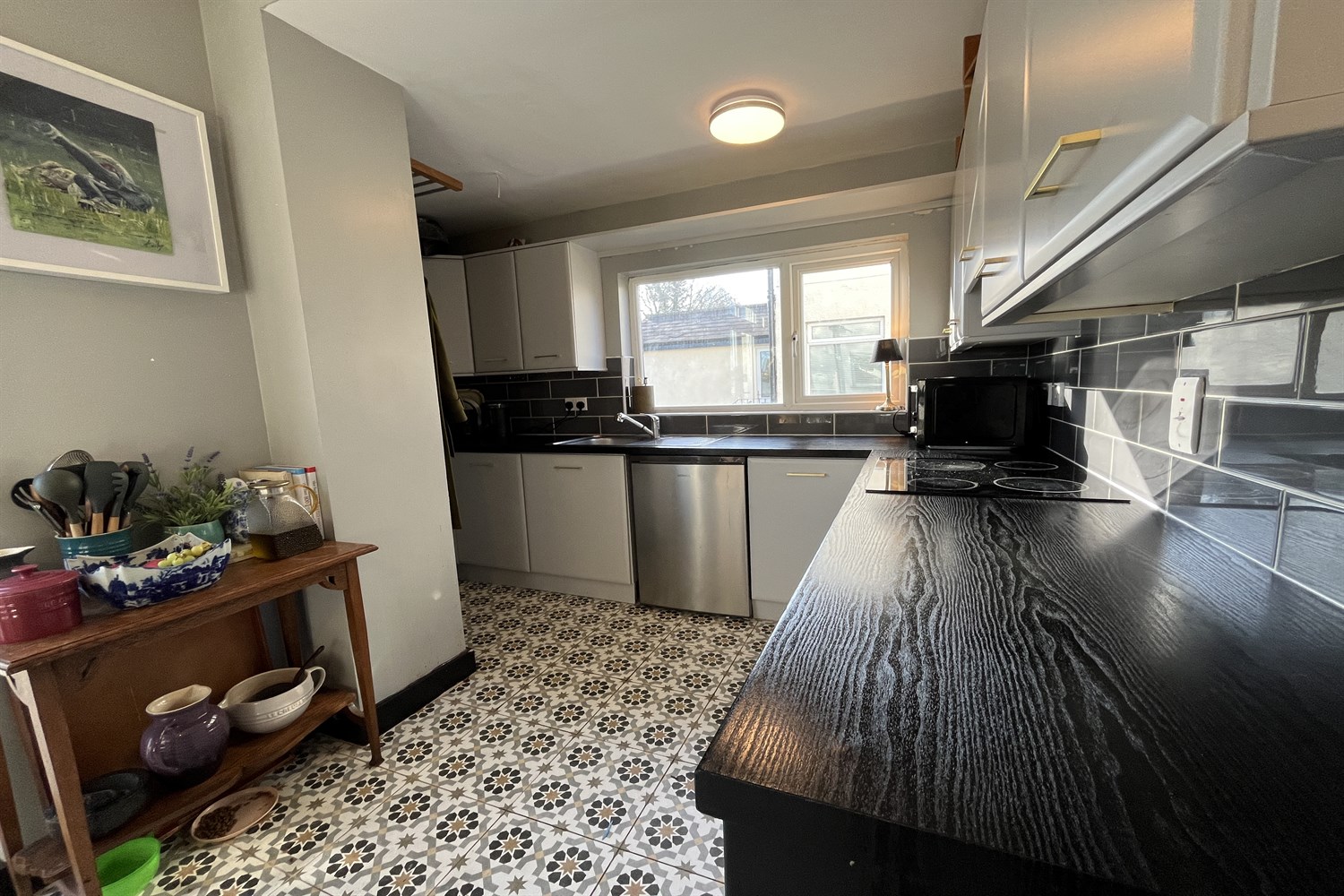 Solid wood flooring, cupboard containing immersion heater.