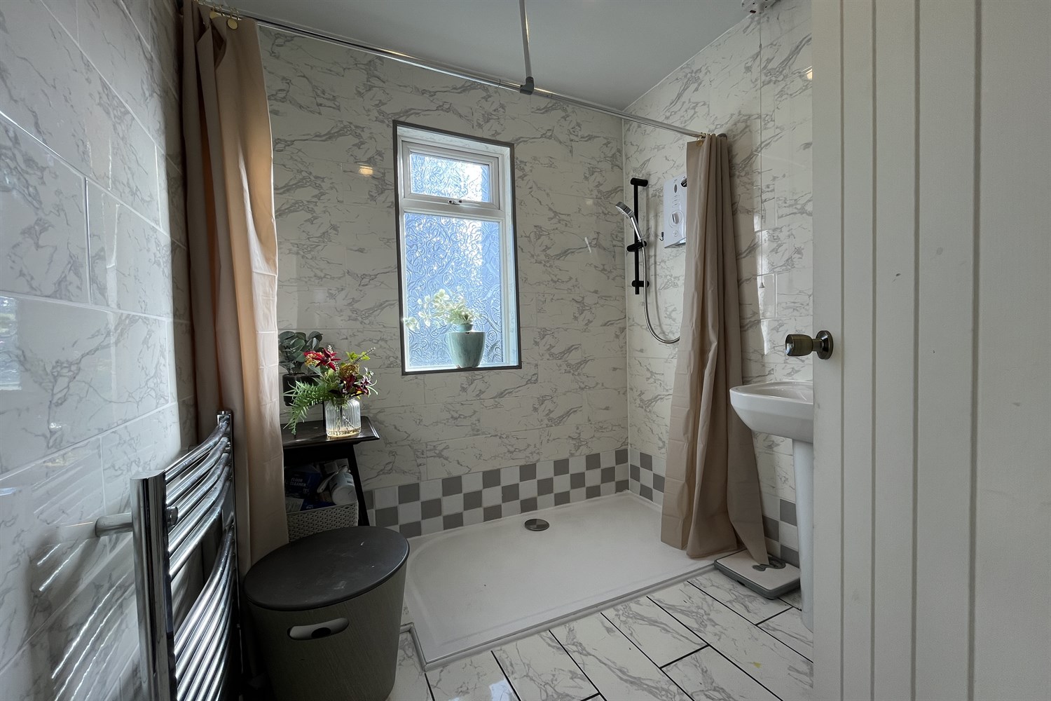 Ceramic tiled floor, fully tiled walls, wall mounted chrome ladder radiator, white suite comprising, pedestal wash hand basin with mixer tap, W.C., 'Mira Sport' electric shower.