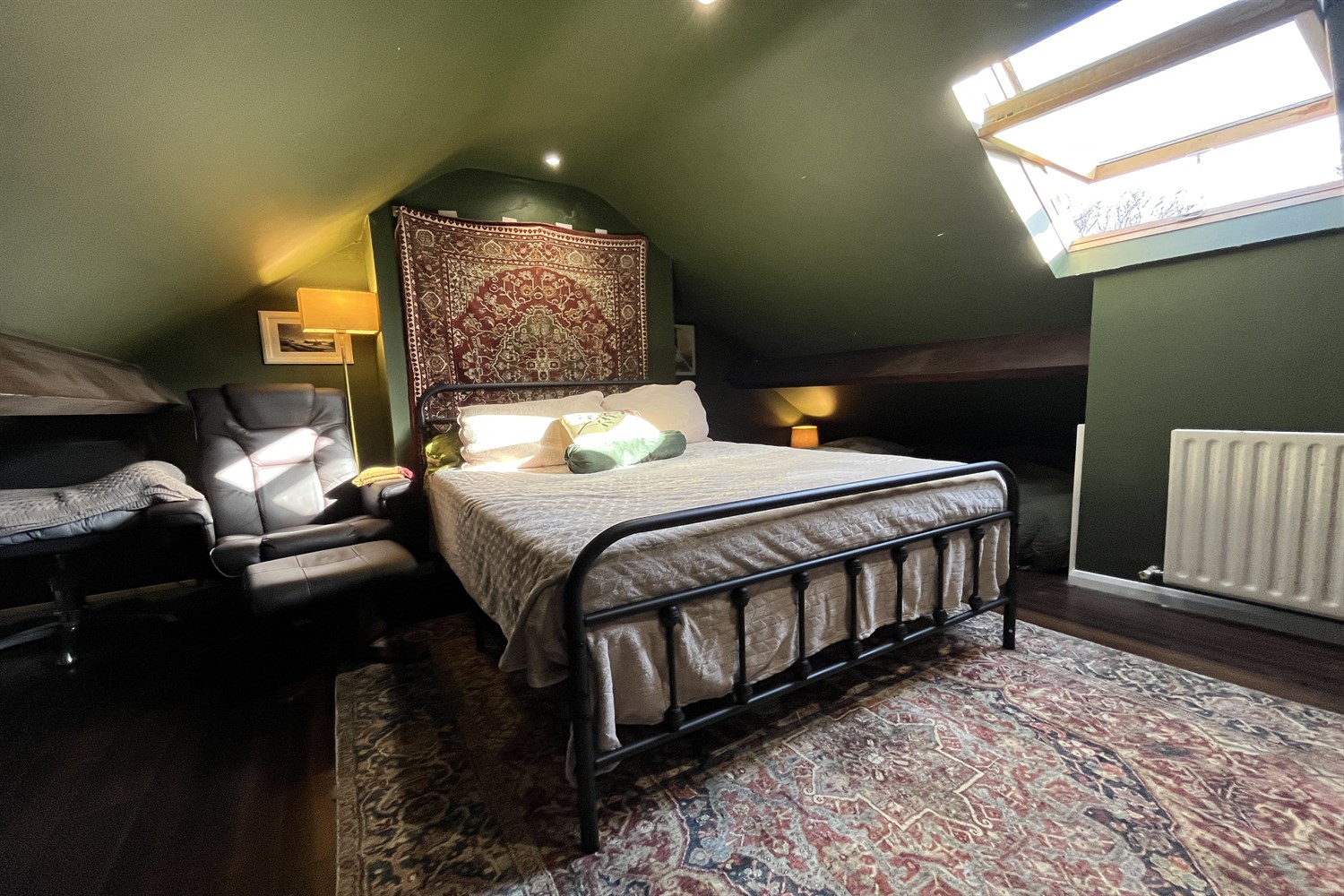 Solid wood flooring, single panelled radiator, 'Velux' style window, ventilation system.