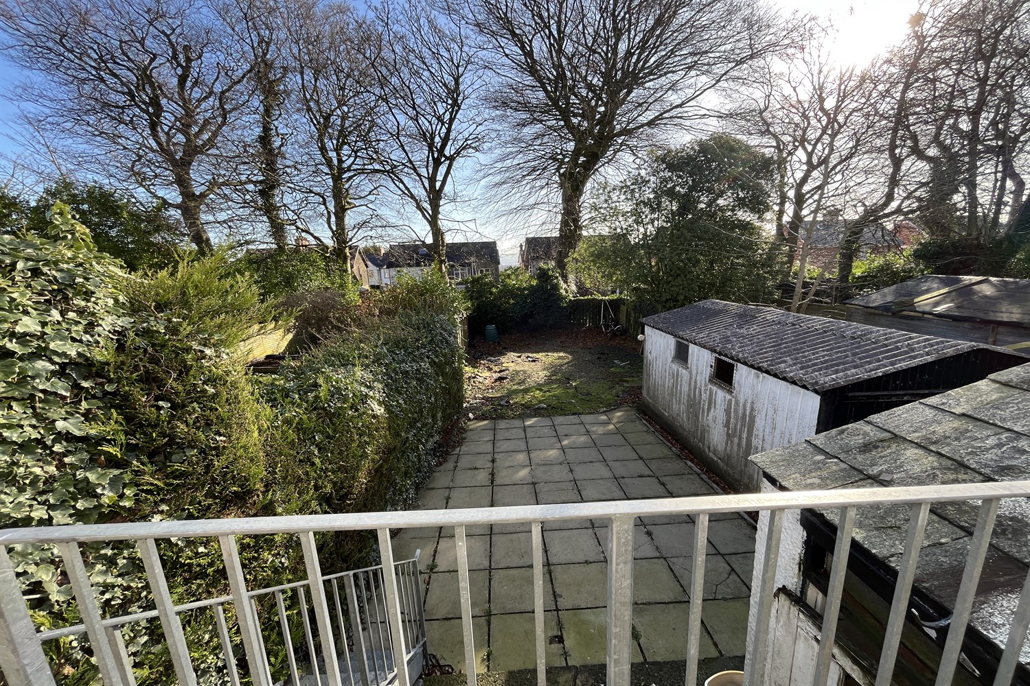 Rear: Purpose built metal balcony, paved area, concrete garage, shed, pvc oil tank, tree lined garden.