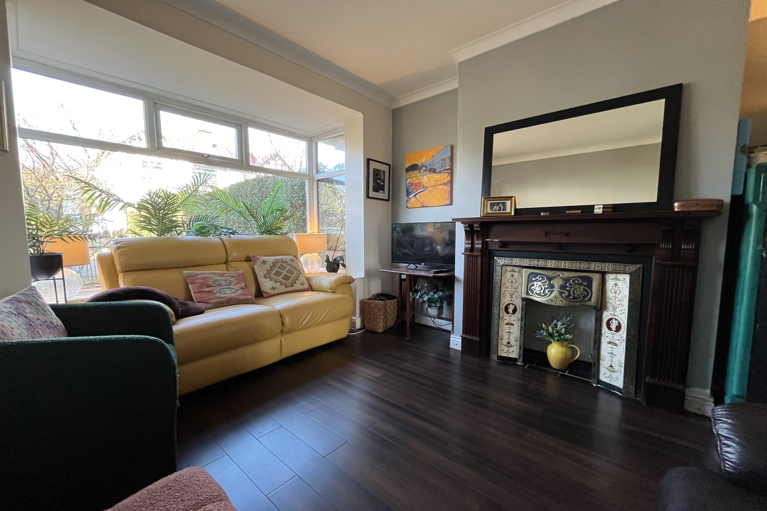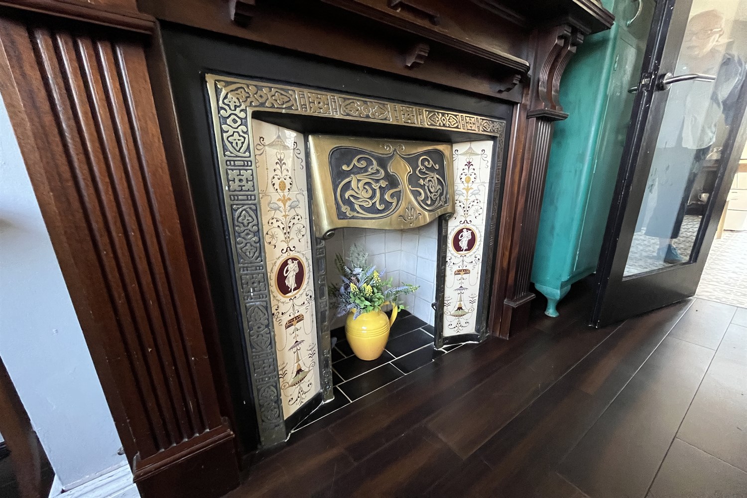 Wood effect ceramic tiled floor, double panelled radiator, fire place with wood surround, brass and decorative tiled insets, doors to: