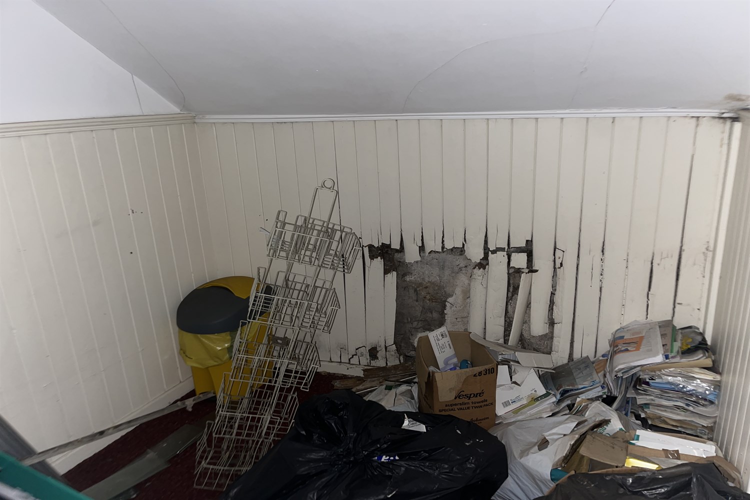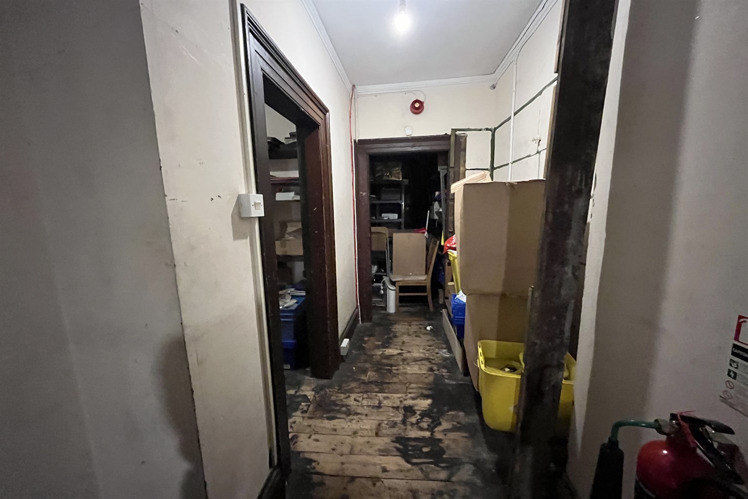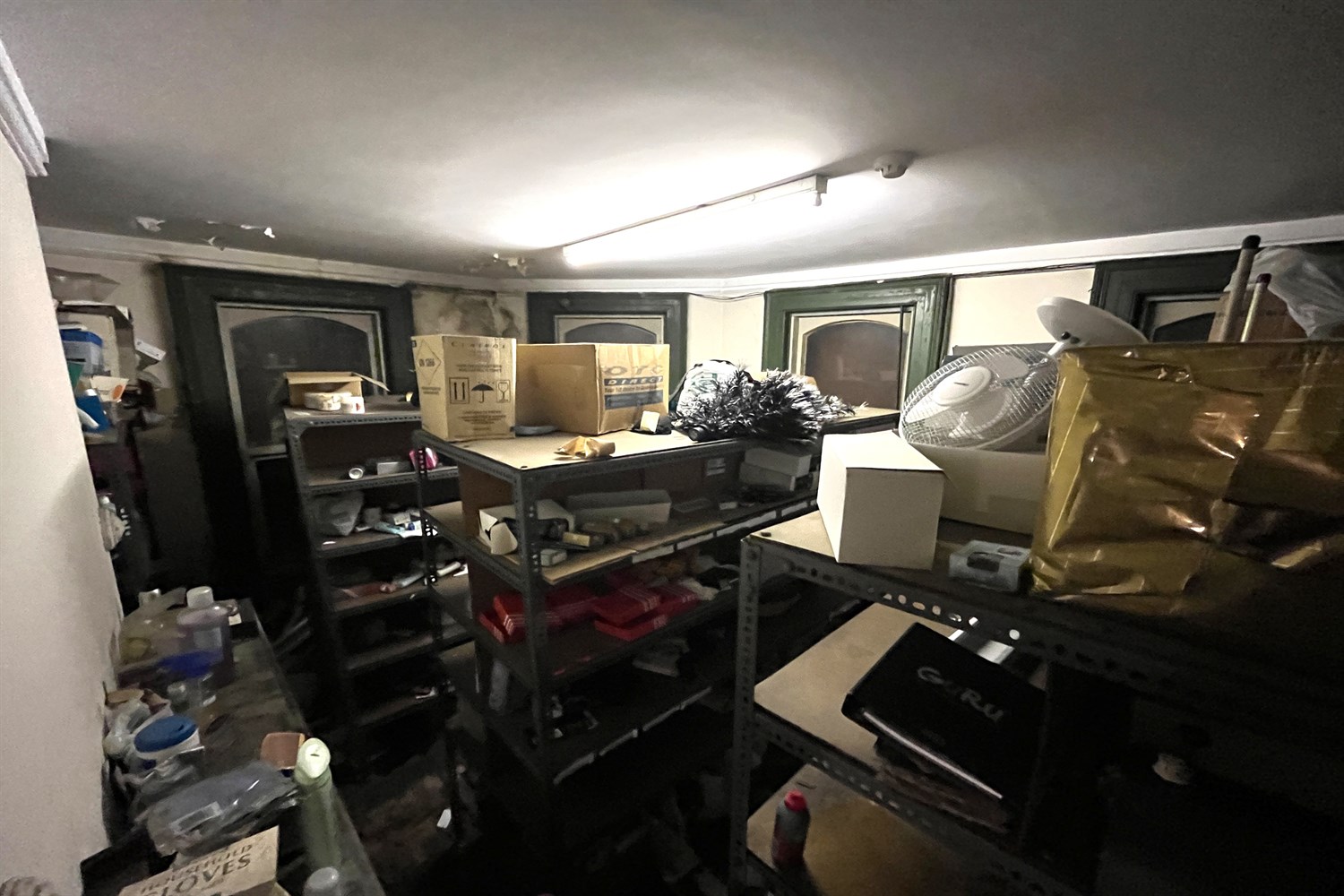 Main shop, carpeted floor, display shelving, door to stairs and door to side.