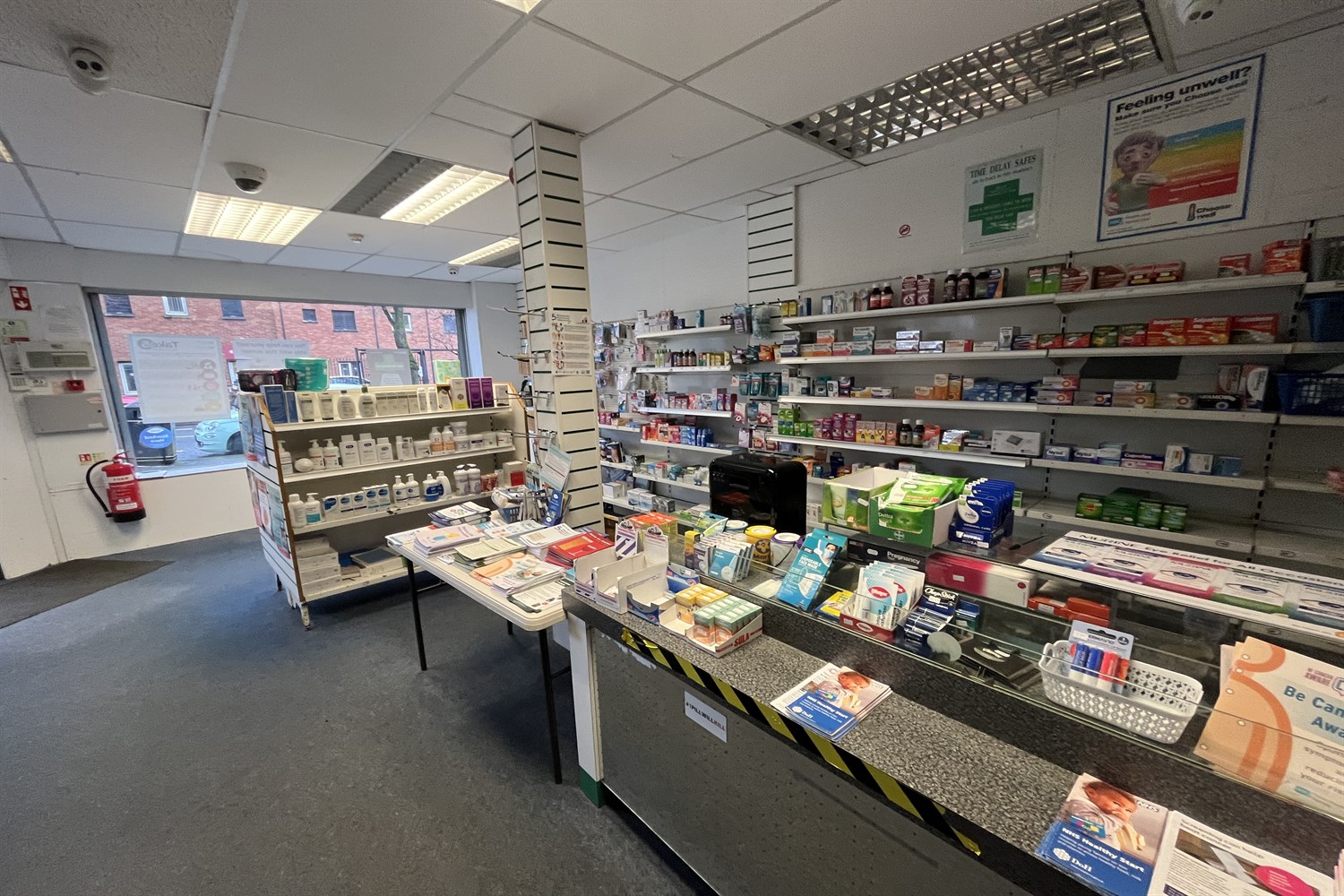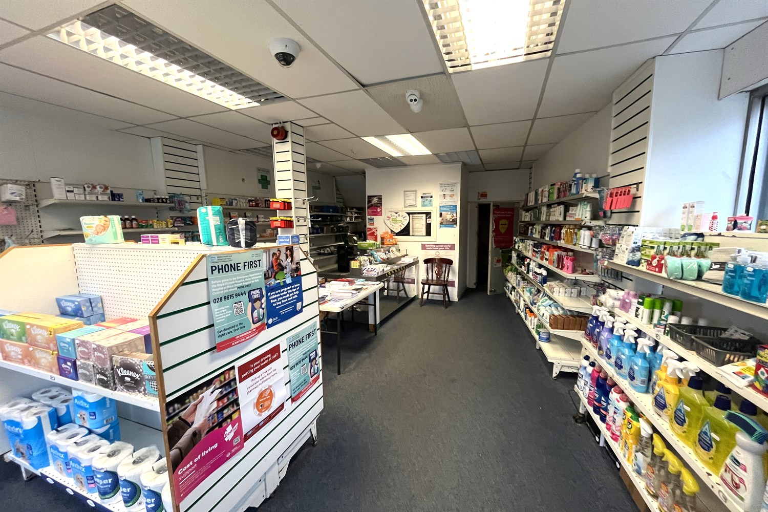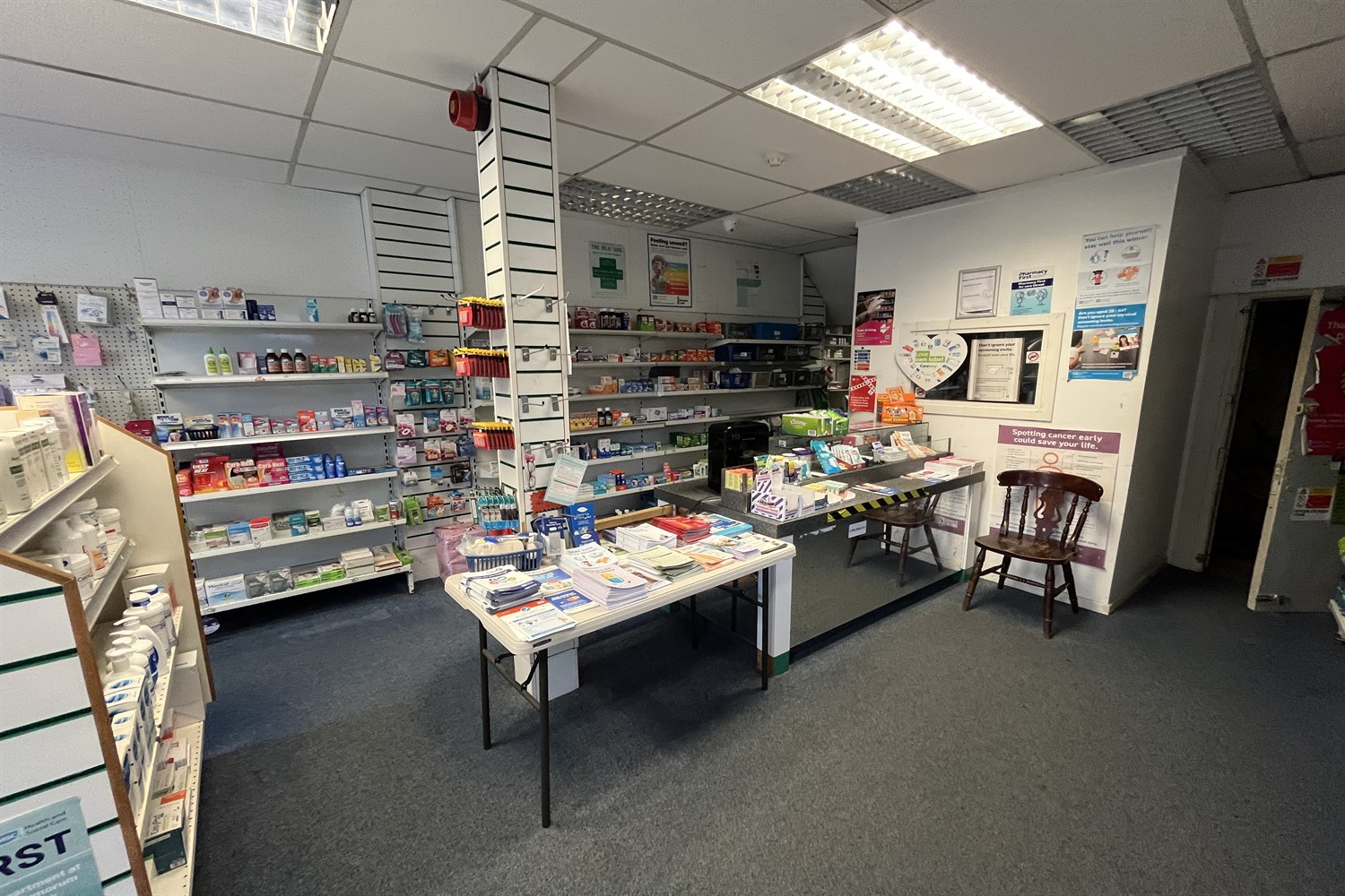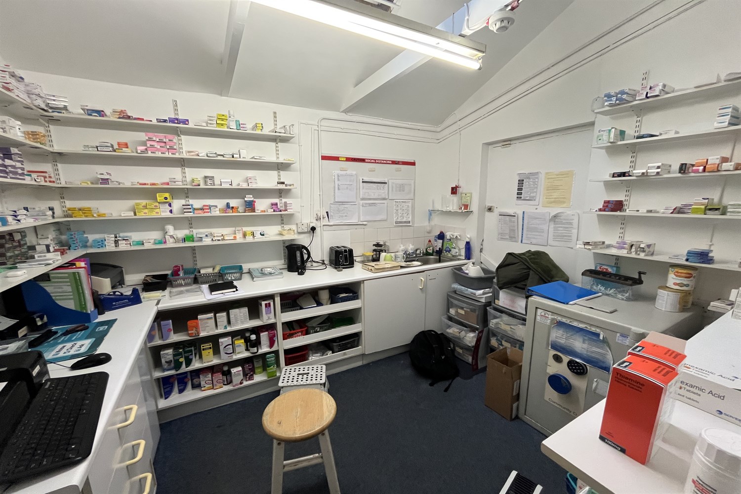 Dispensary, sink unit, display shelving.