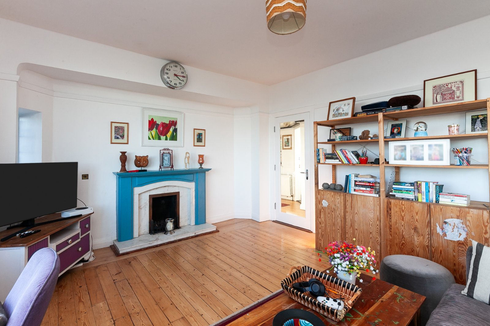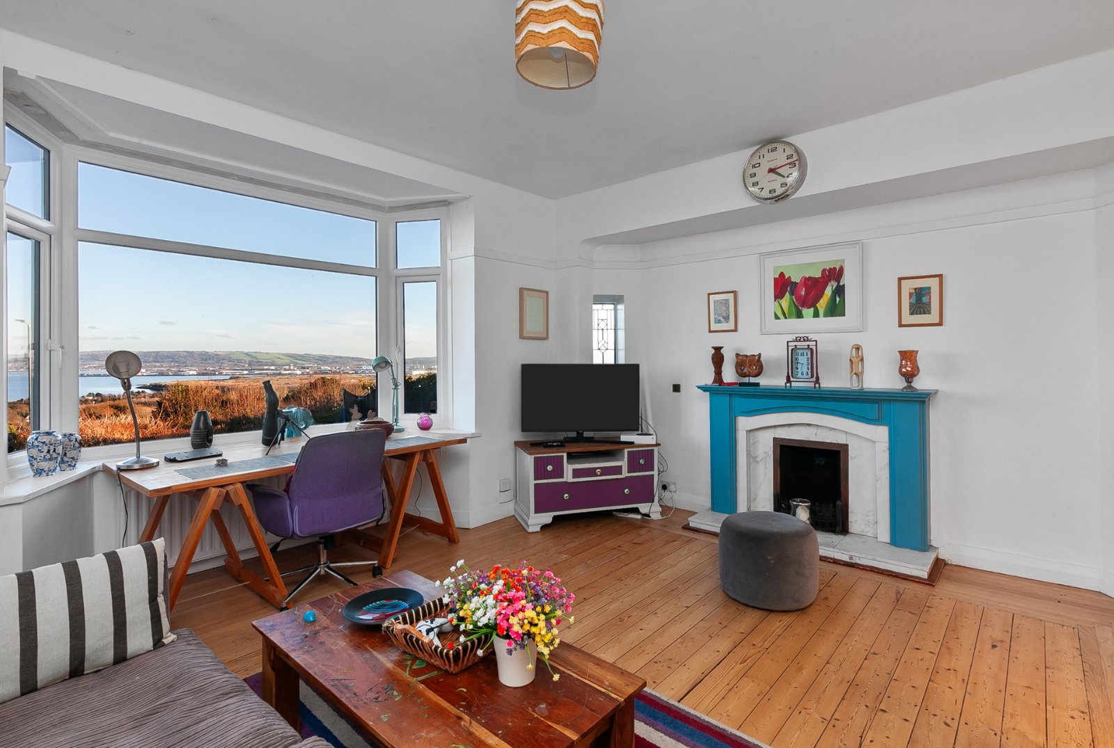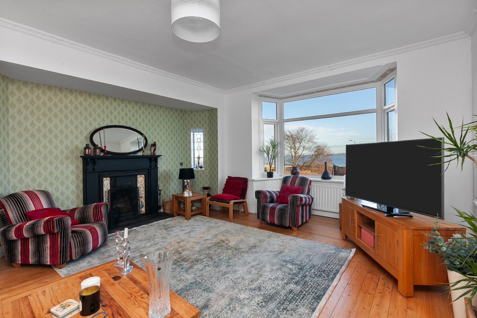 Solid wood strip floor, solid wood fireplace with tiled inset and slate hearth, cornice ceiling and bay window