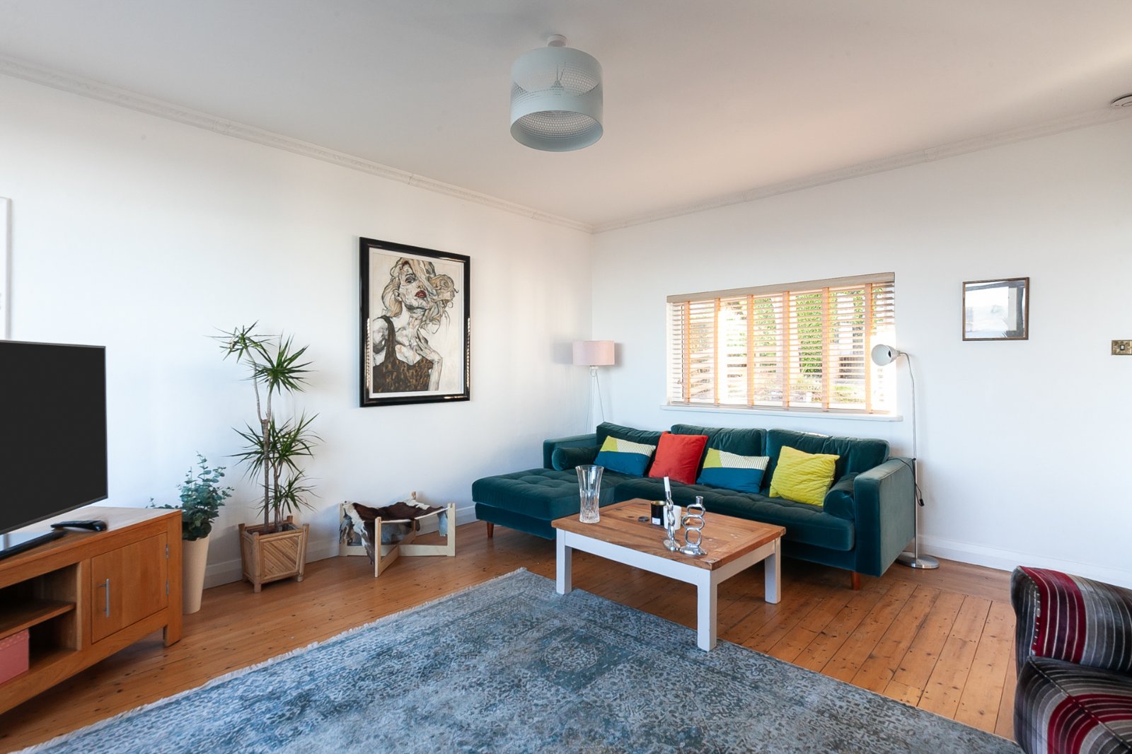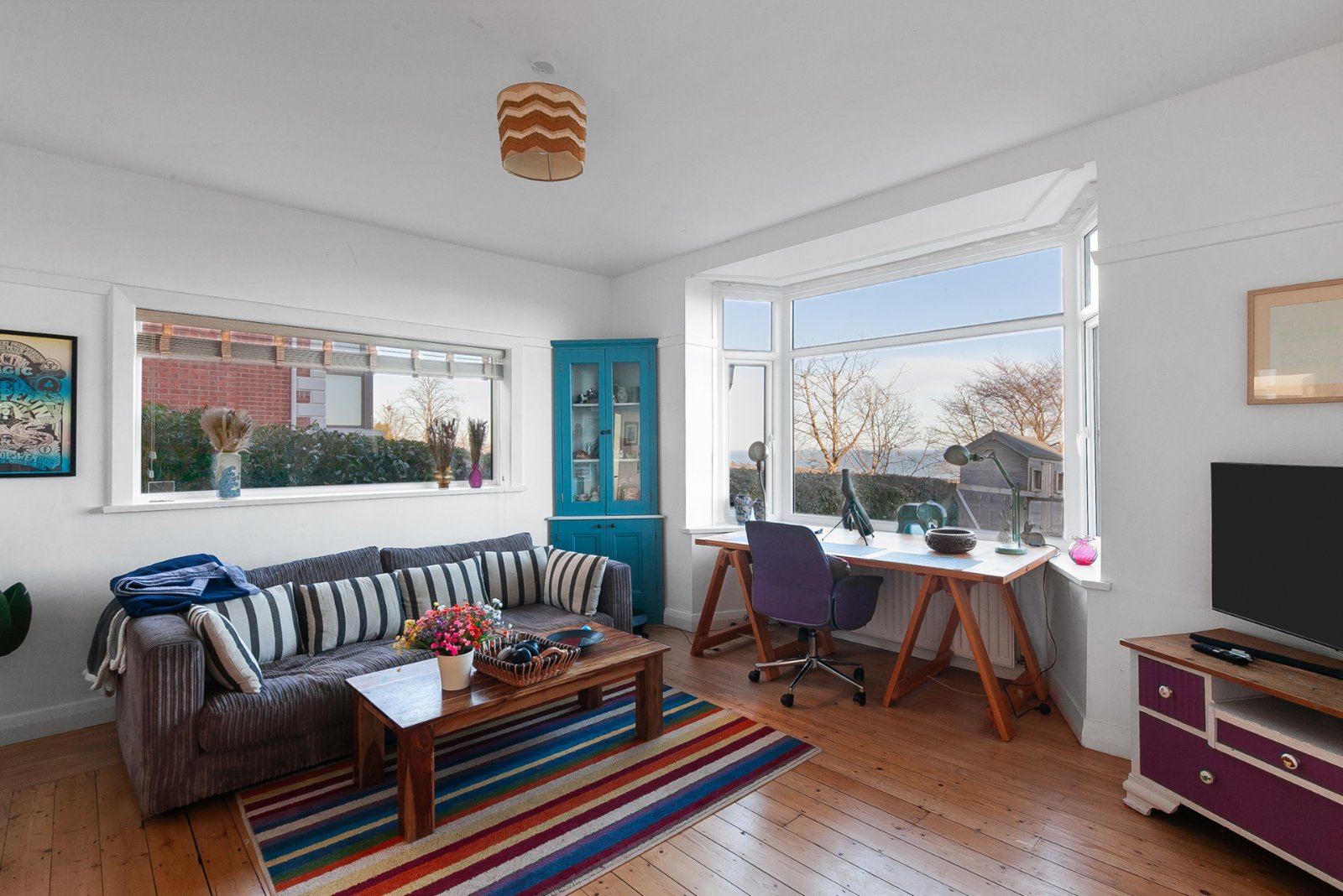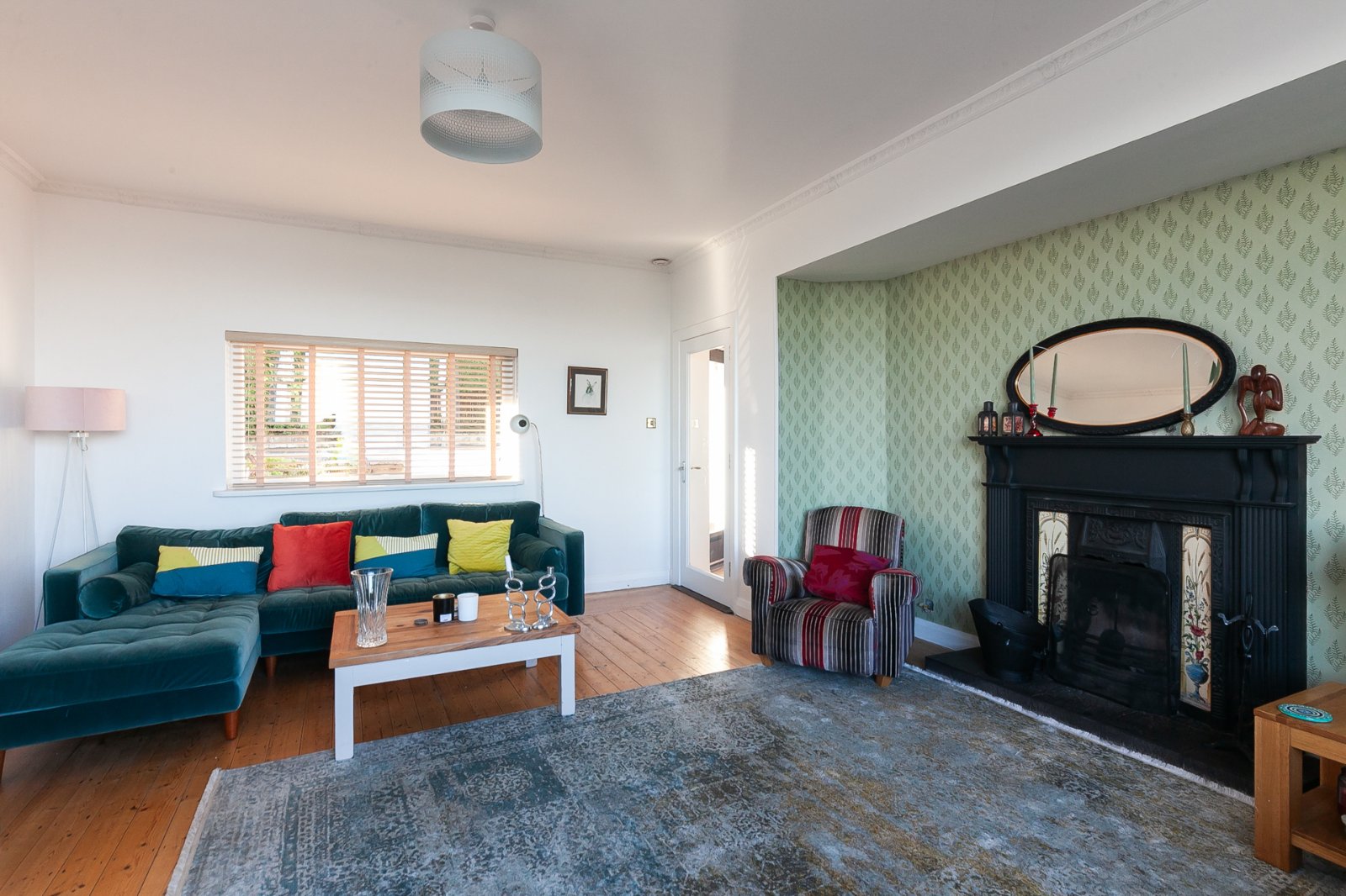 Solid wood strip floor, solid wood fireplace with tiled inset and slate hearth, cornice ceiling and bay window