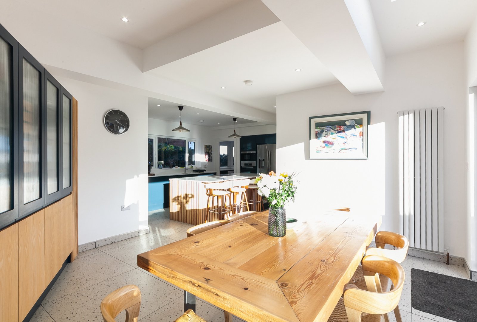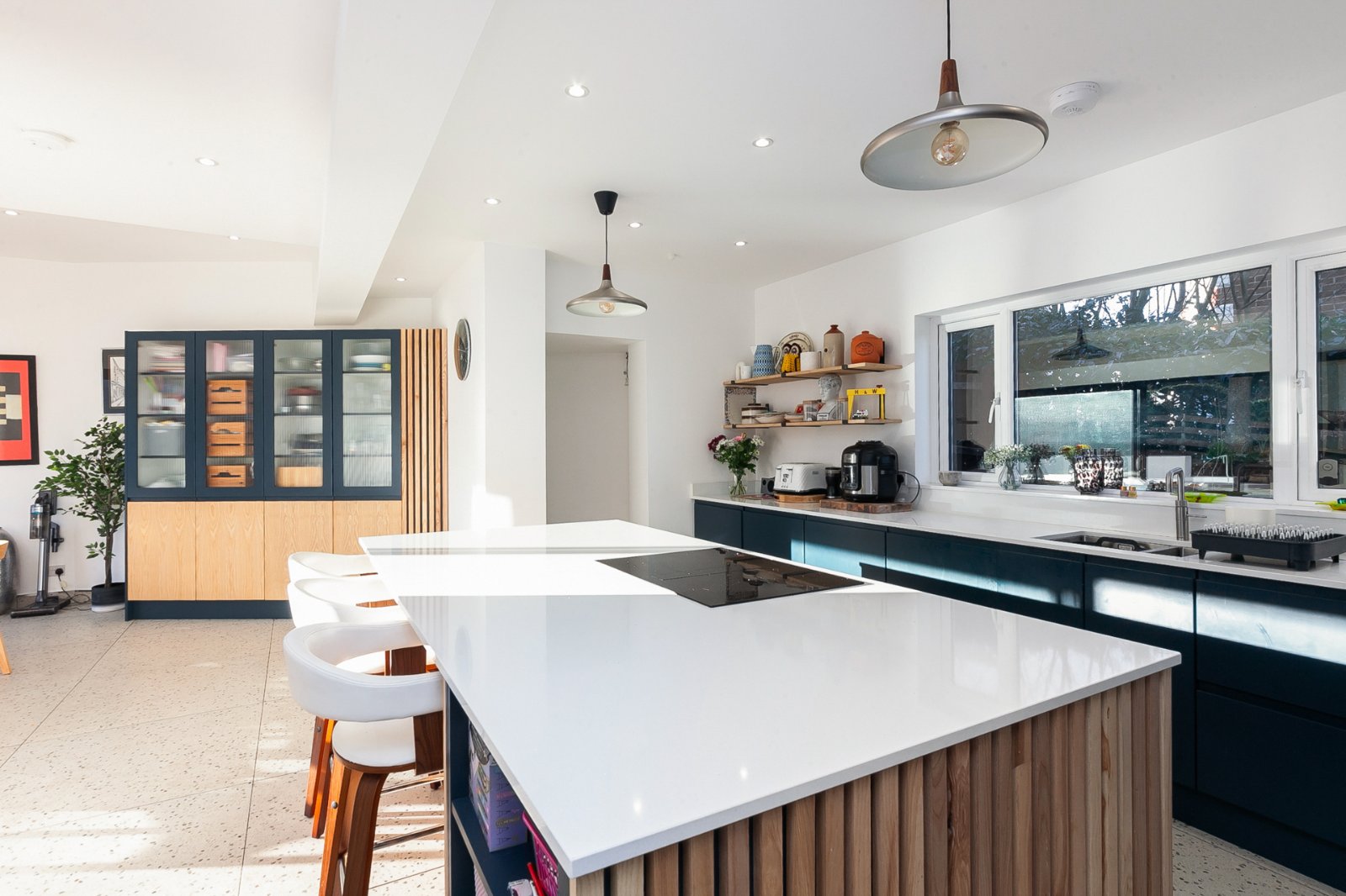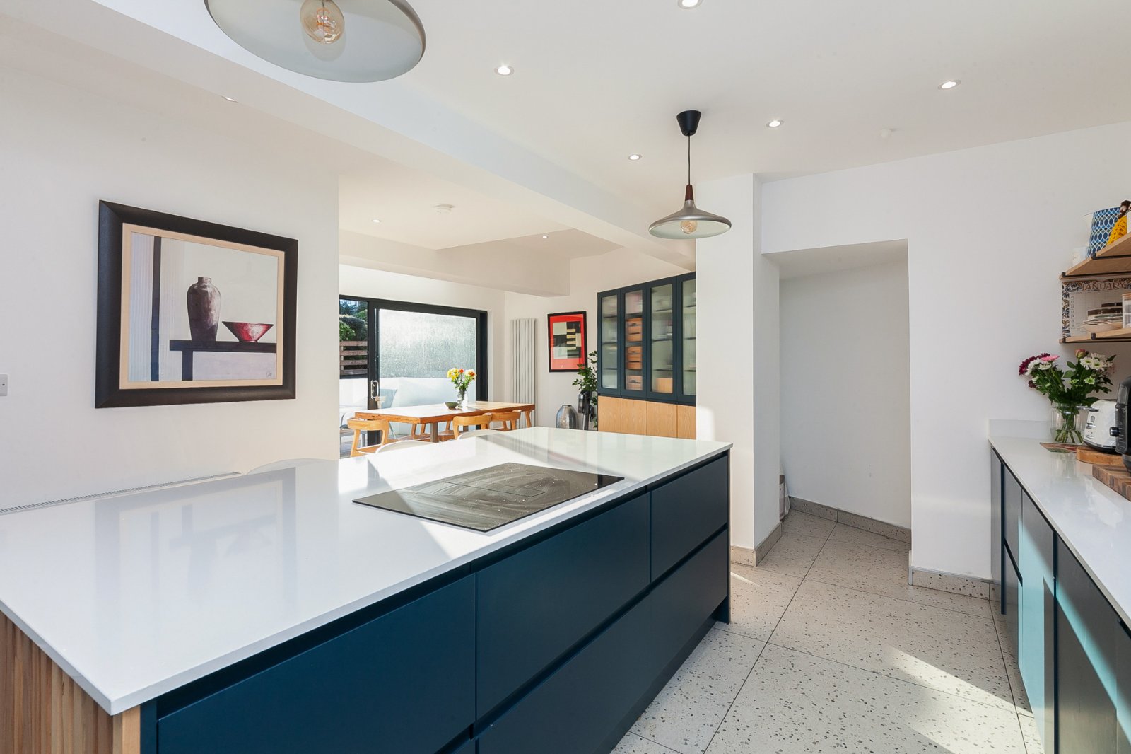 Spotlighting, tiled floor, range of high and low level units, granite worktops, large family island, ceramic hob, integrated dishwasher, 'Caple' 1.5 bowl inset stainless steel sink unit, 'Miele' electric oven, Samsung microwave, space for American fridge freezer, bi-folding sliding door leading to patio