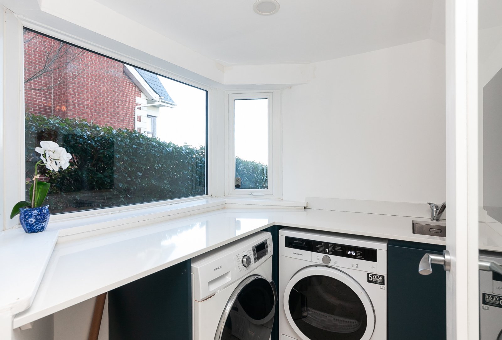 Tiled floor, range of high and low level units, quartz worktops, inset stainless steel sink unit, plumbed for washing machine, space for tumble dryer