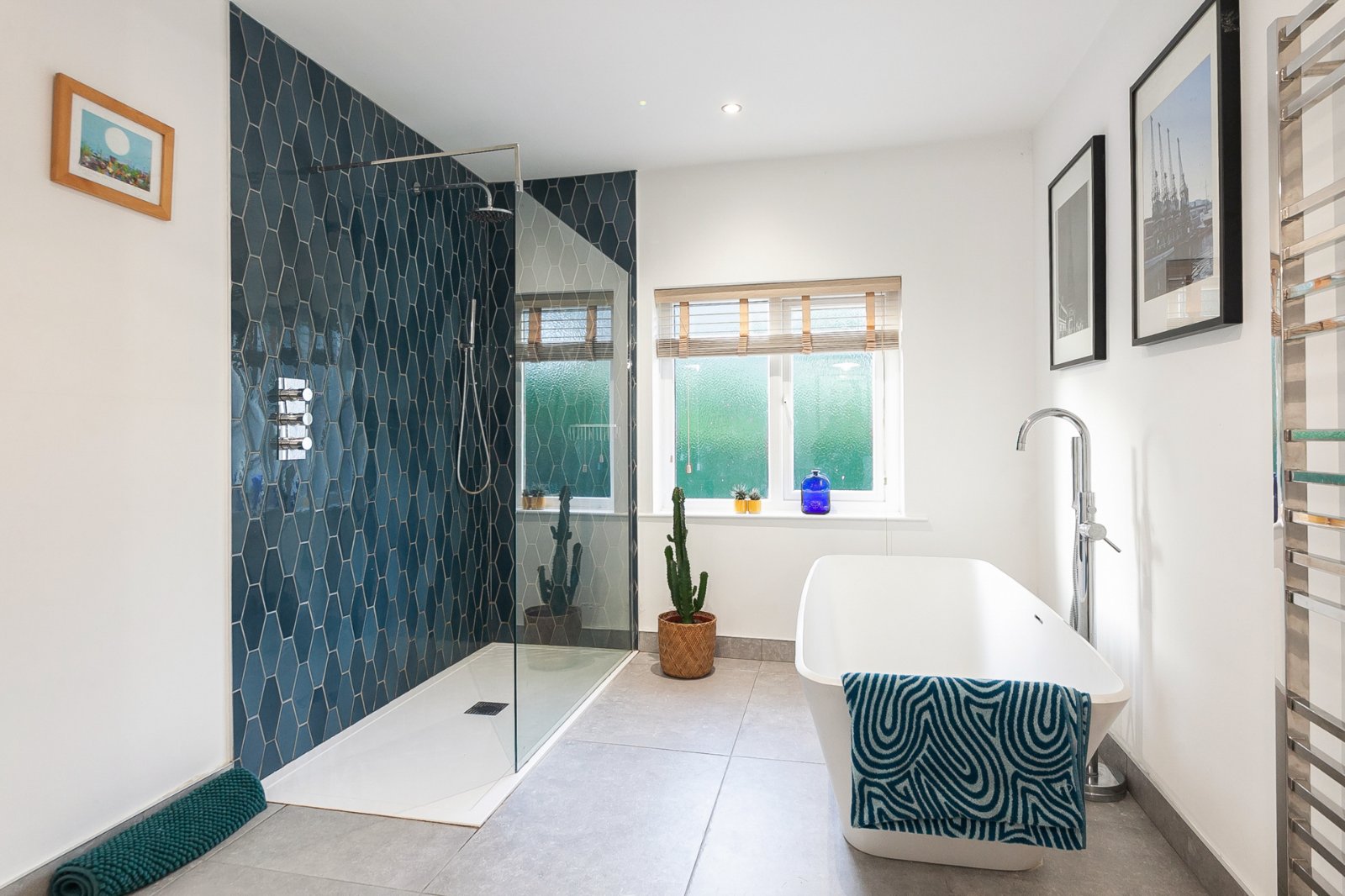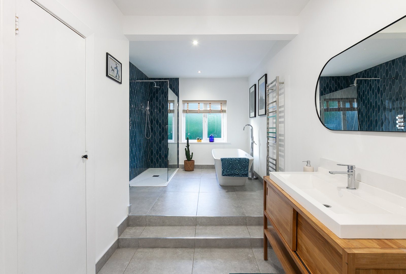 Tiled floor, pedestal wash hand basin with vanity unit, low flush WC, large freestanding bath with telephone hand shower, large walk in tiled shower with rainhead attachment, spotlighting, extractor fan
