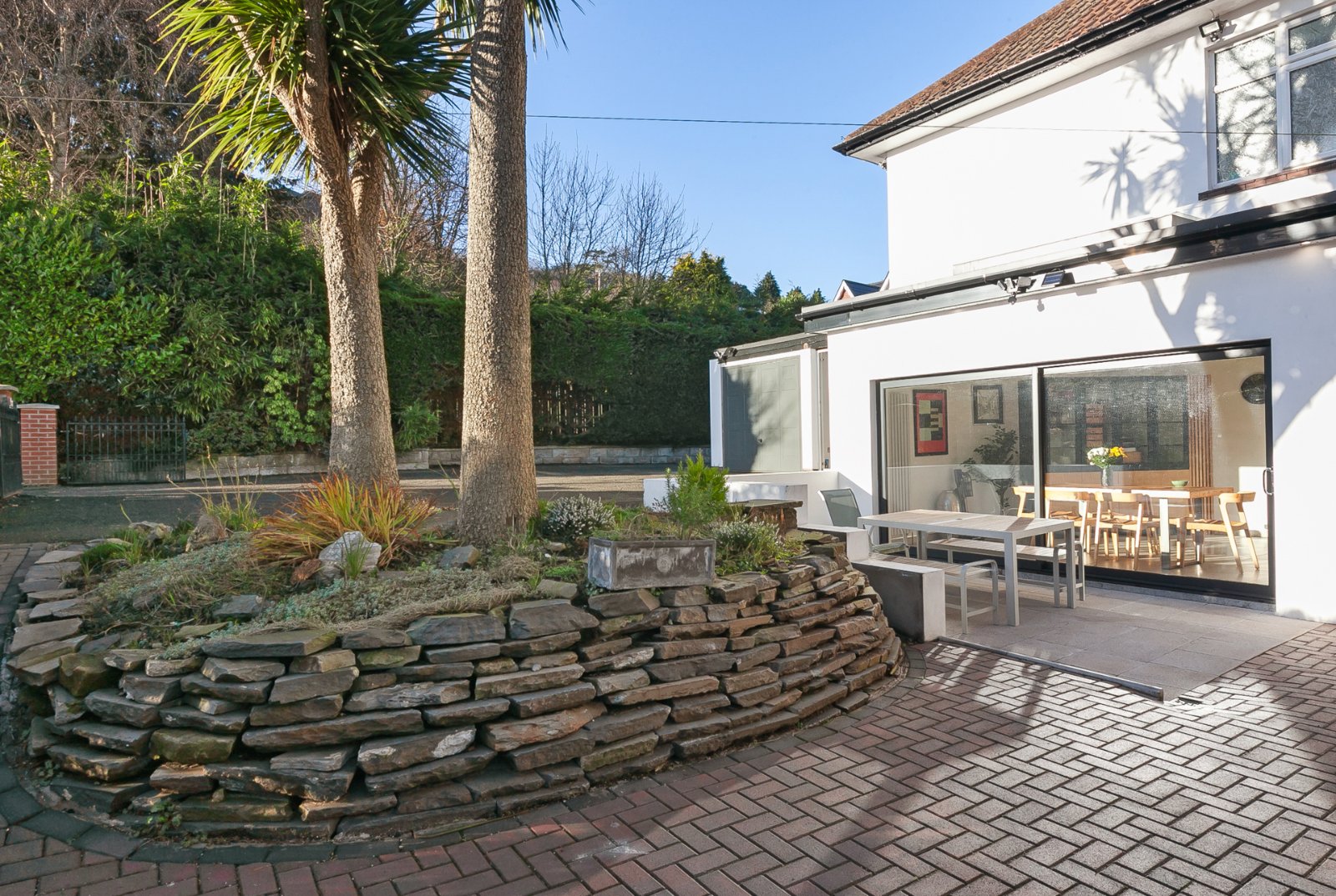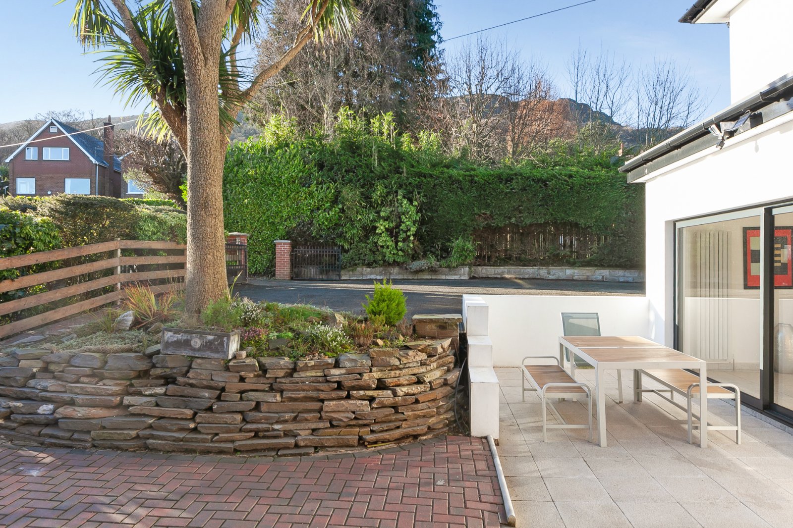 Paved path off the front of the road to garden in lawn enclosed by mature hedge with feature stone wall. To the rear with brick entrance pillars with gates leading to tarmac driveway with paved sitting area and raised flower bed.
