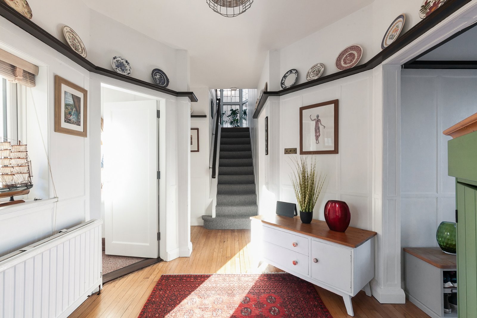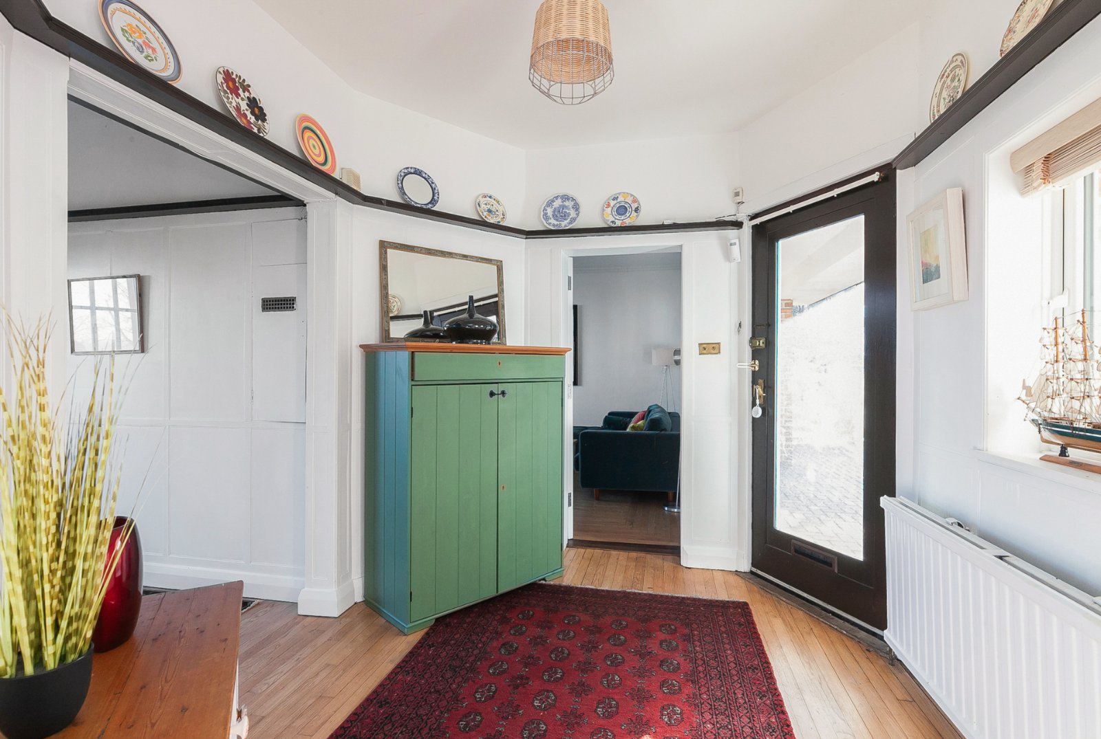 Glazed internal front door to reception hall with solid wood strip floor and picture rail