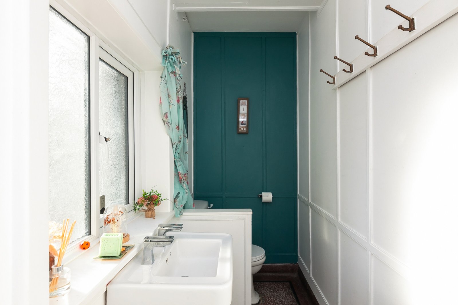 Terrazo floor, low flush WC, pedestal wash hand basin