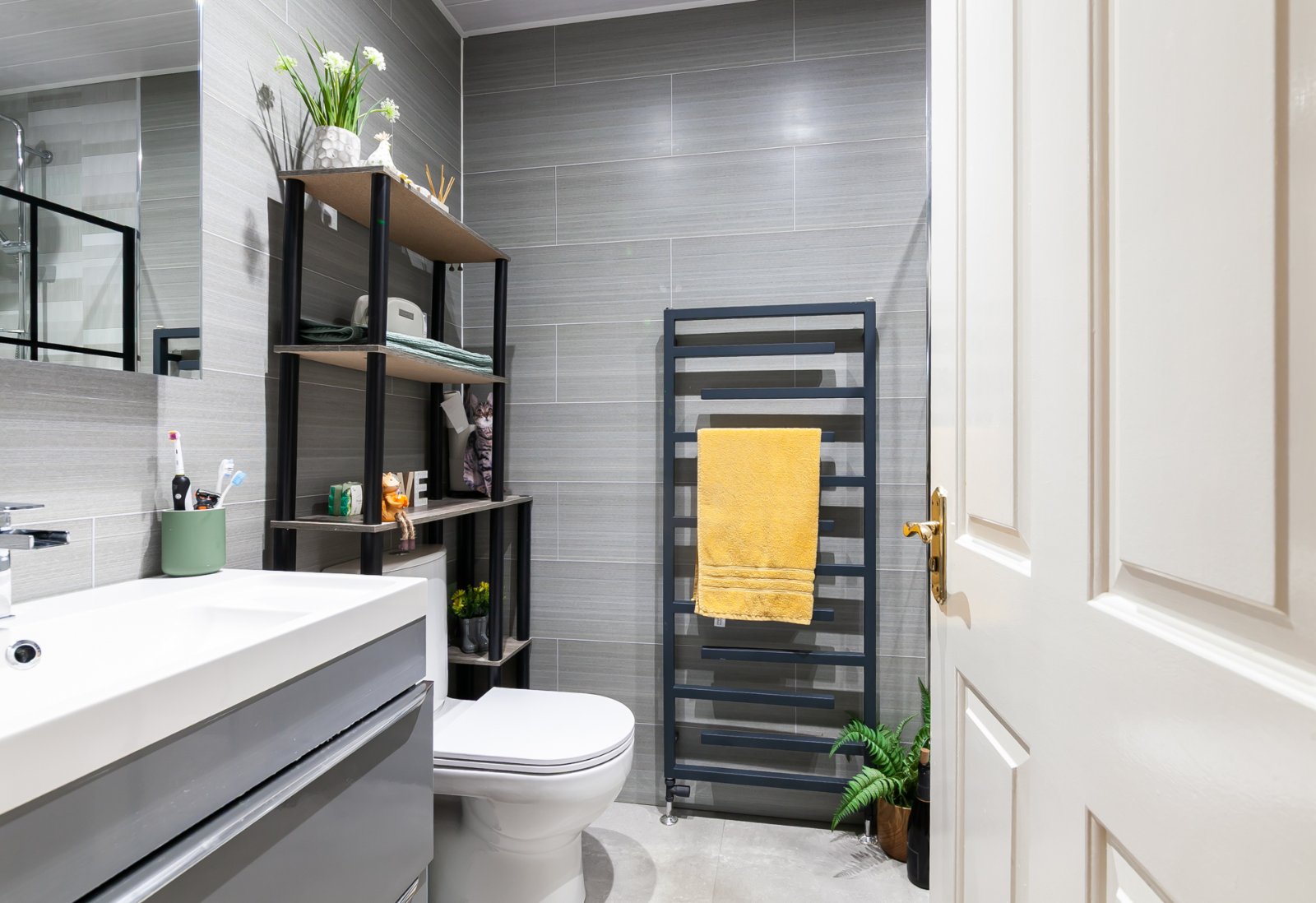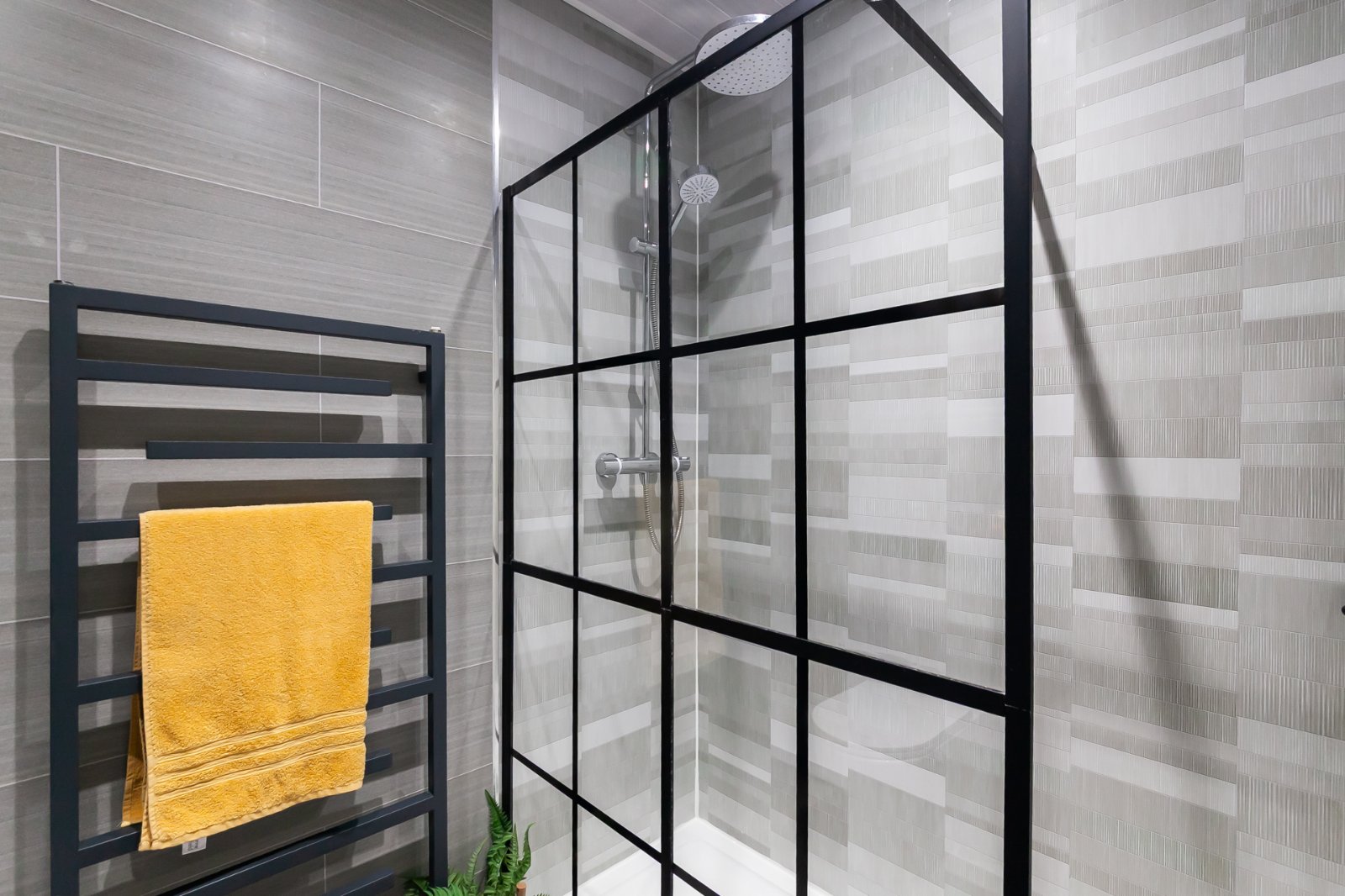 Contemporary shower room comprising of a walk in shower, ceramic bowl sink unit with vanity storage unit underneath. Low flush WC, heated towel rail, tiled effect walls and floor, recessed lighting and extractor fan.