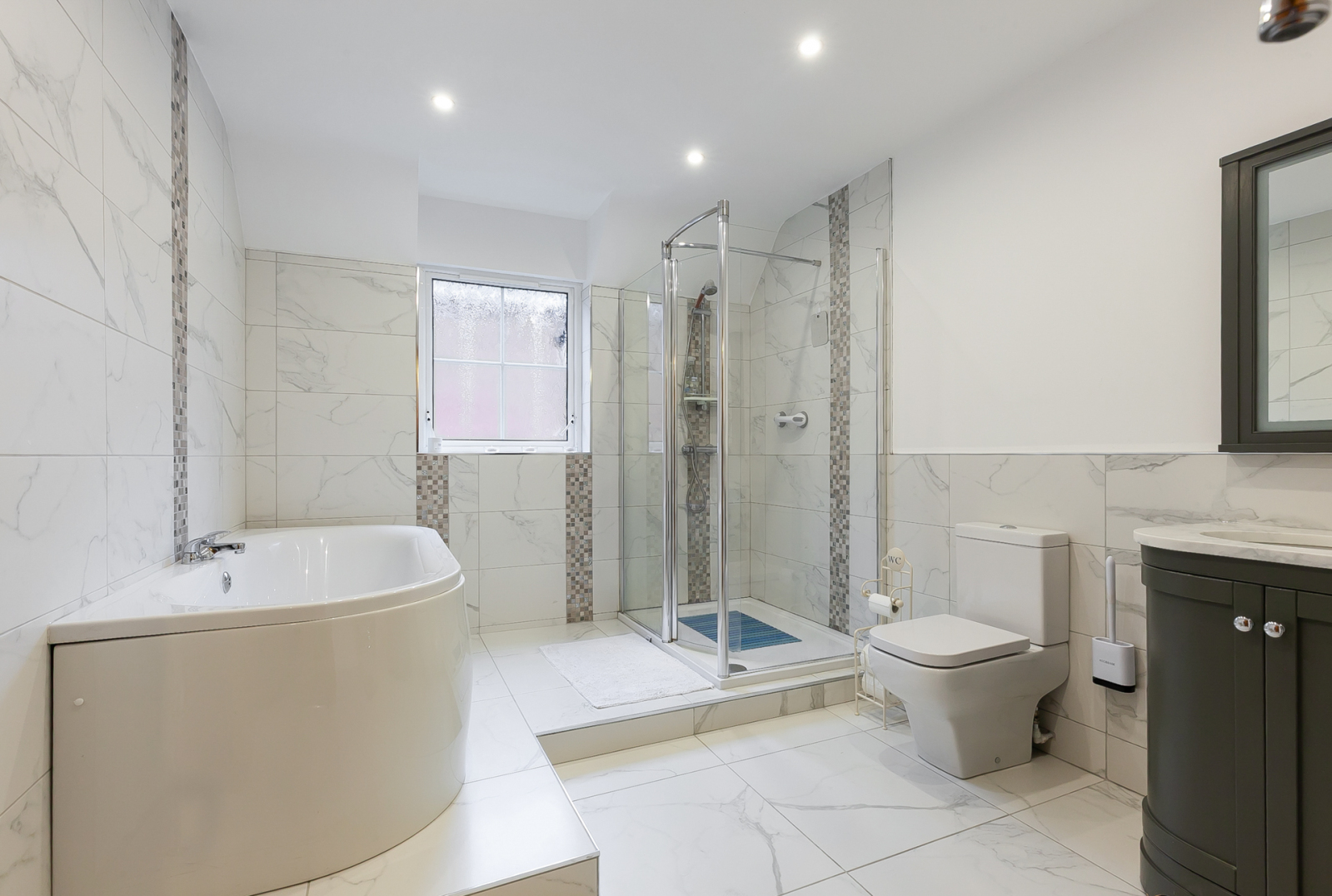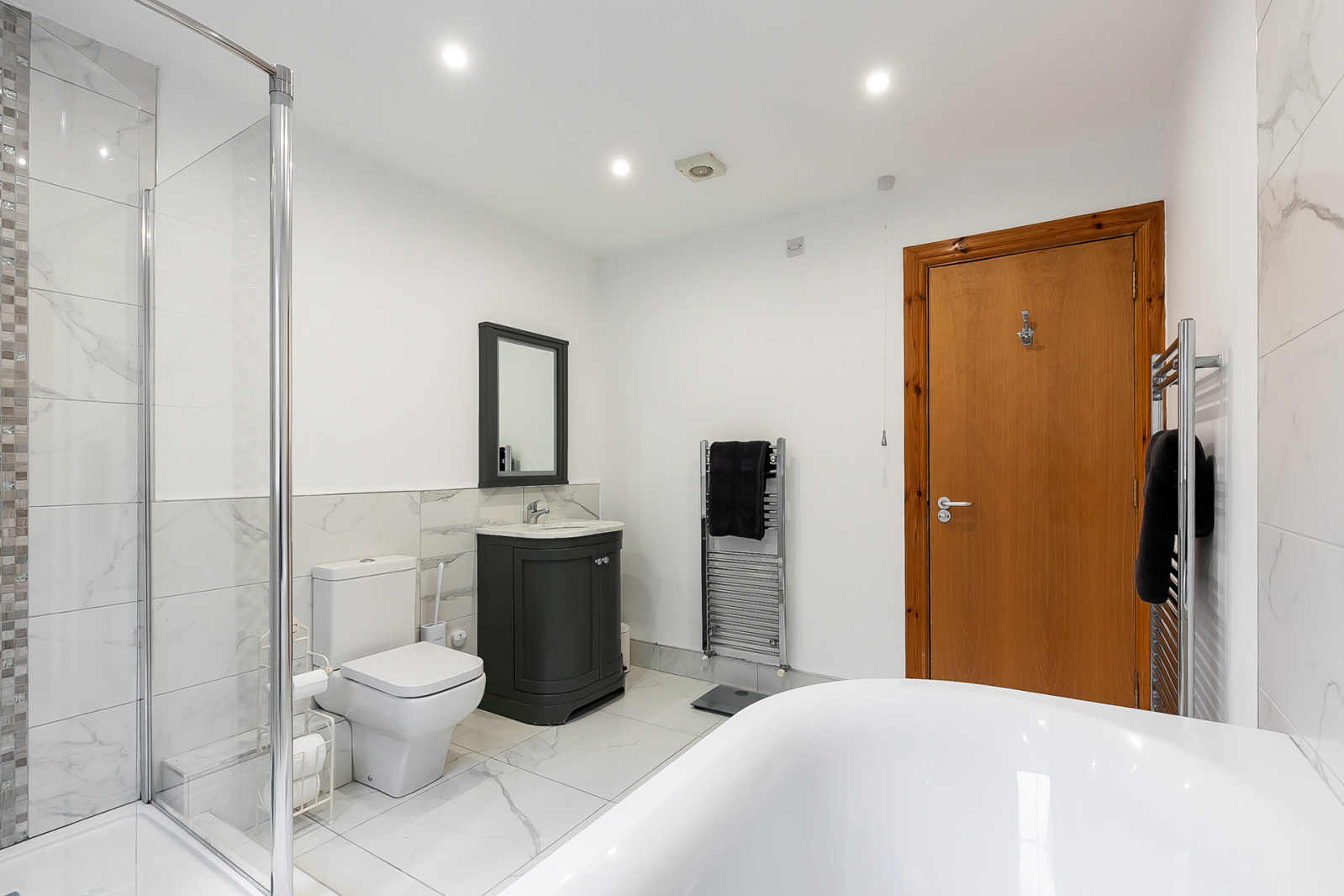 Contemporary bathroom suite comprising of paneled bath with mixer tap, enclosed corner shower unit with shower screen, low flush WC, ceramic bowl sink unit with mixer tap and vanity storage underneath. Chrome heated towel rail, partly tiled walls, tiled floor, recessed lighting and extractor fan.