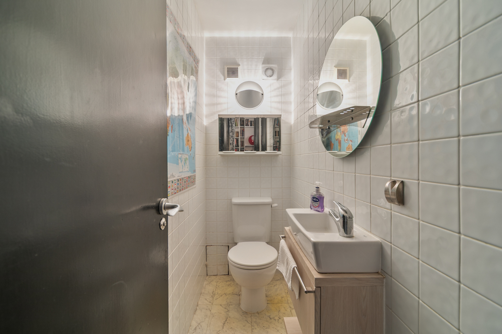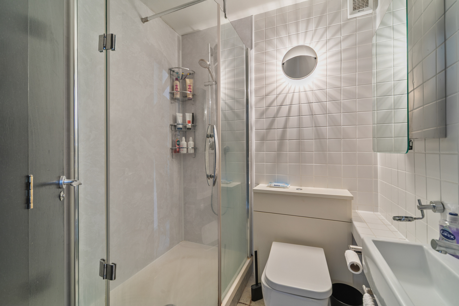 Low flush WC, sink with mixer tap, fully tiled walls and floor.