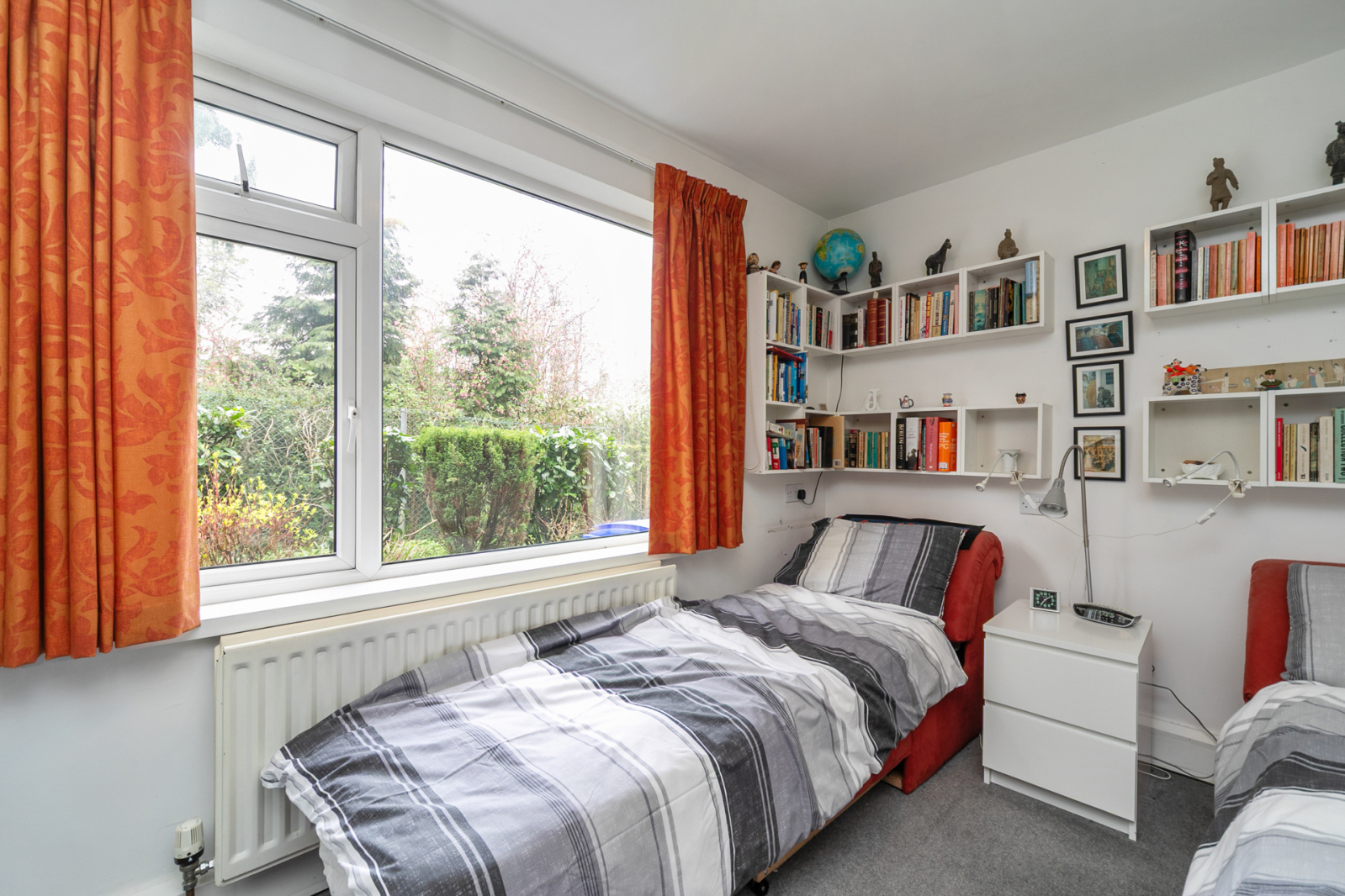 Wooden front door, carpeted, mirrored slide robes and built in bookcase.