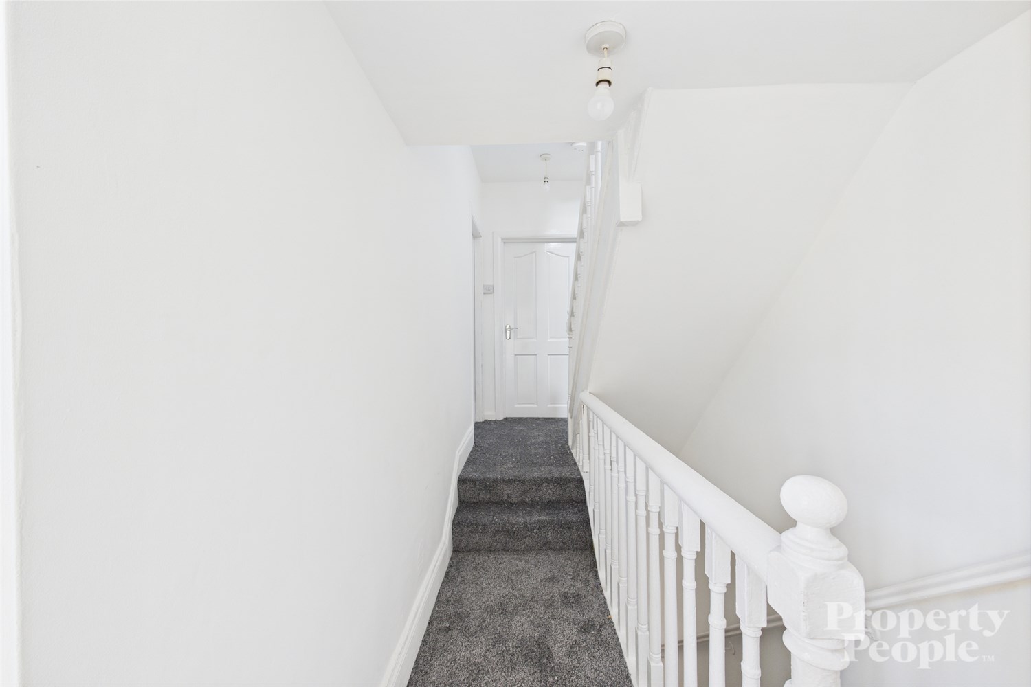 Welcoming entrance hallway with laminate wooden floor, single panel radiator and electric sockets.