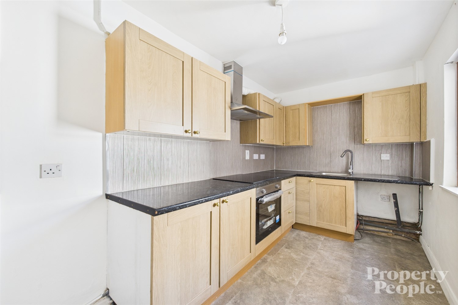 Shaker style kitchen with high and low level units, built in electric 4 ring hob and oven, plumbed for washing machine, single drainer stainless steel sink unit with mixer taps and panelled radiator.
