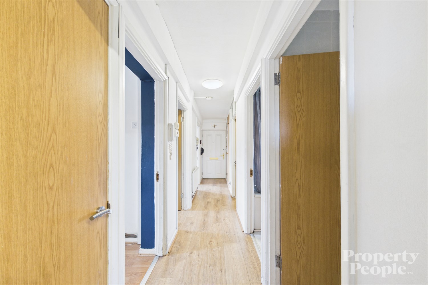 A warm and welcoming entrance hall providing access to the apartments rooms, along with built-in storage cupboards. Finished with laminate wood flooring and a single-panel radiator.