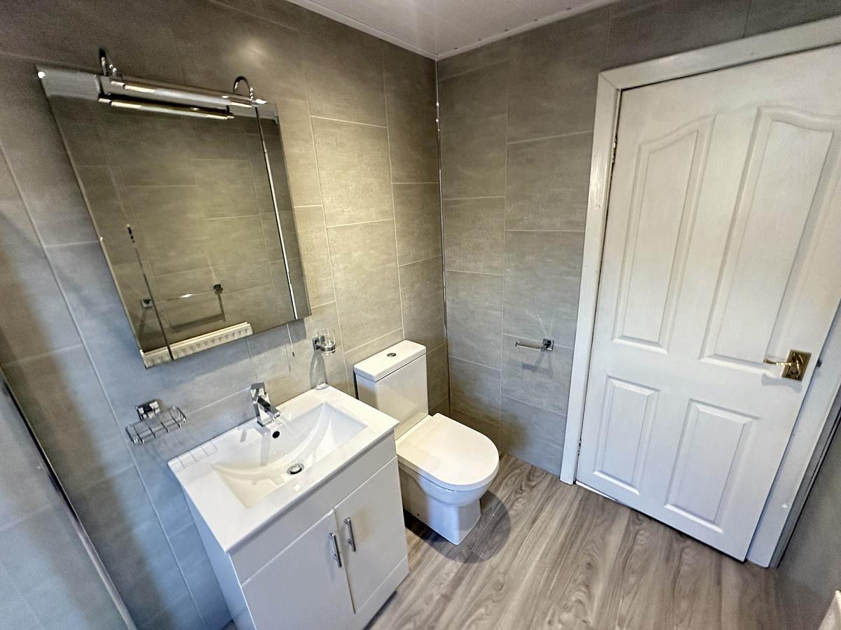 White family shower room with walk in shower, vanity unit wash hand basin, low flush W/C, PVC wall pannelling, vinyl flooring