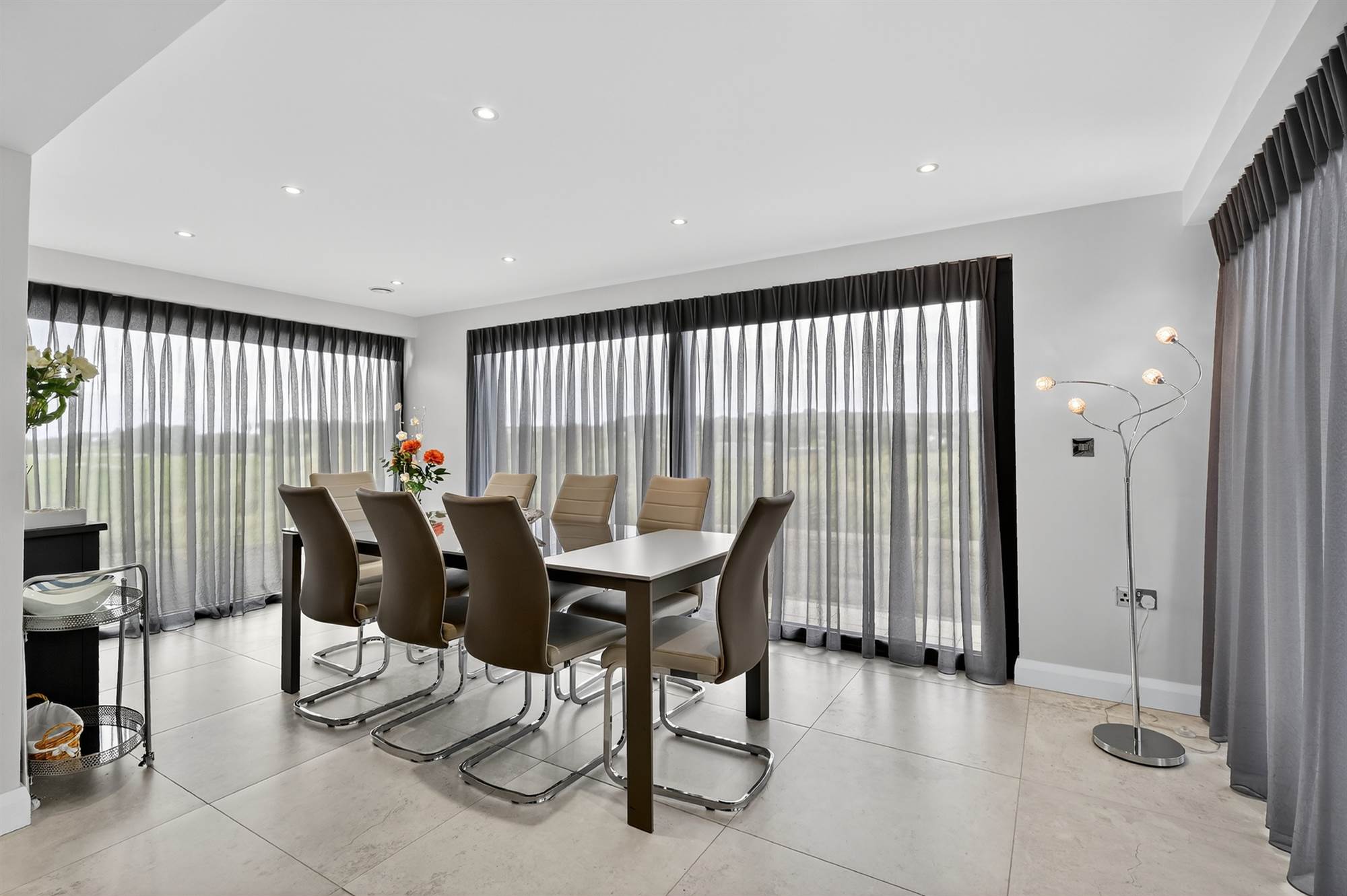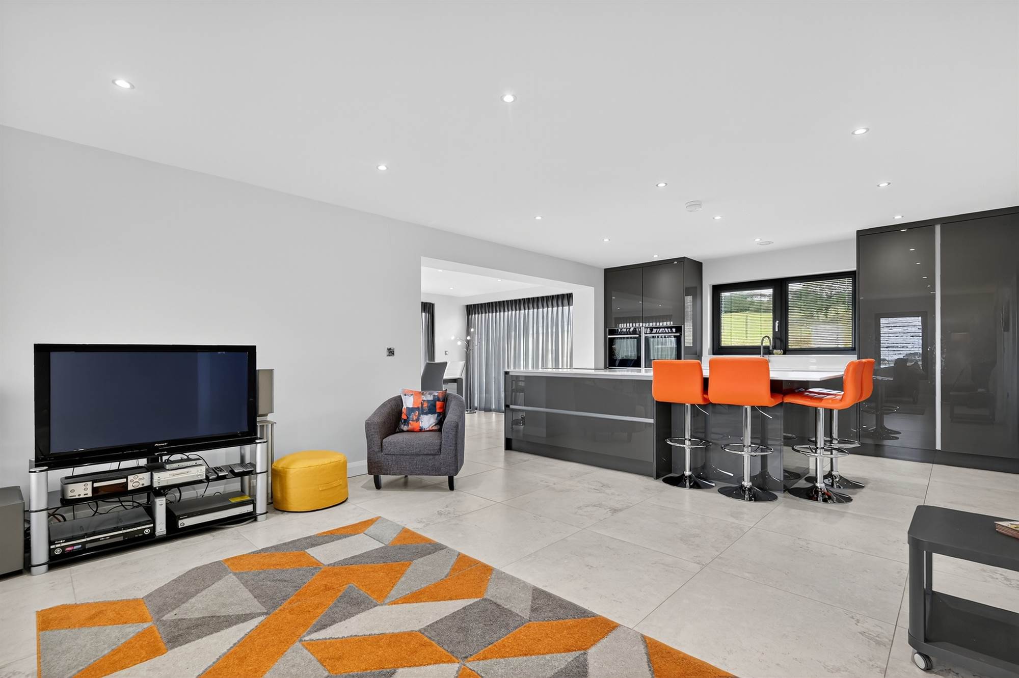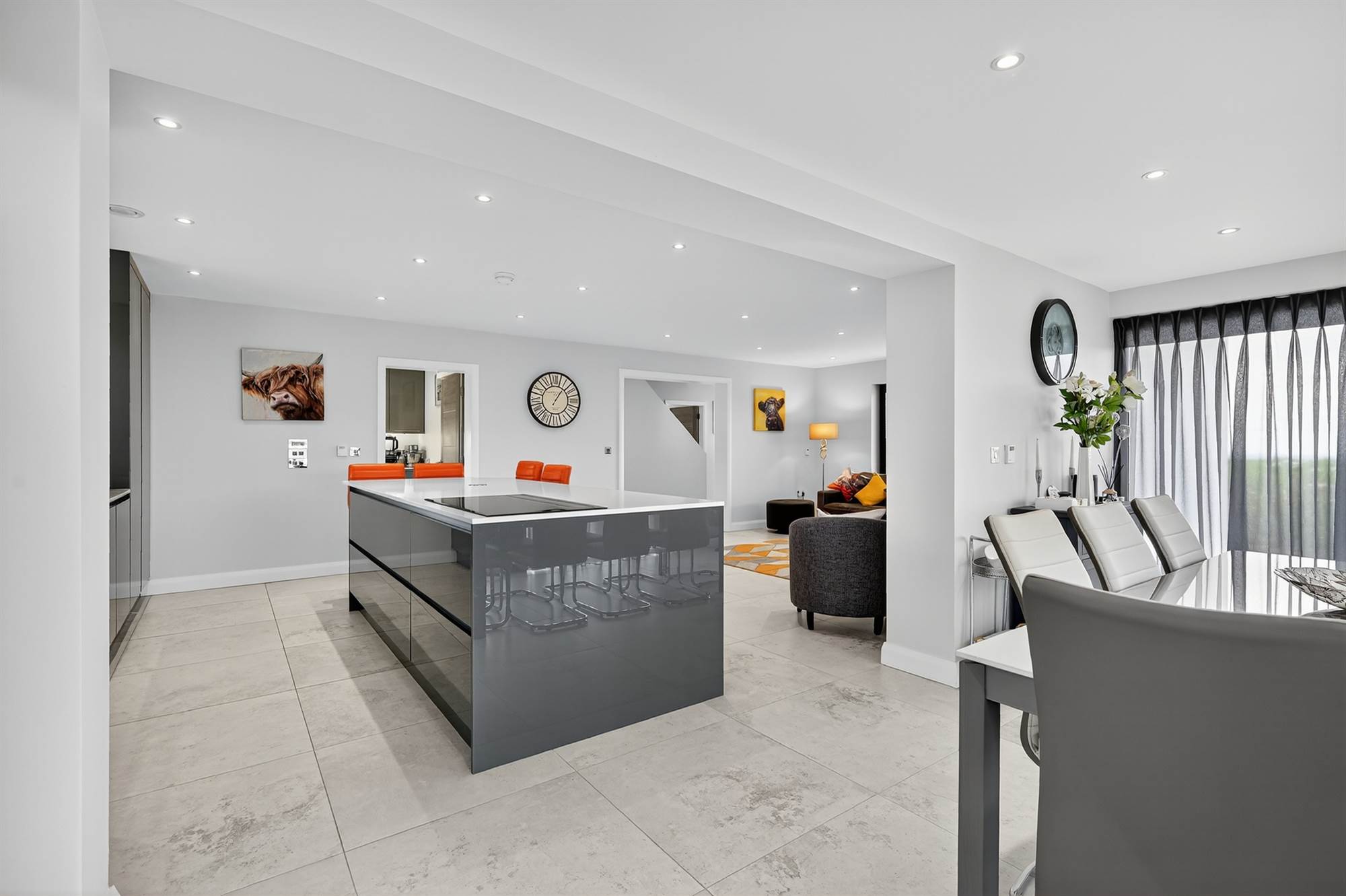 Magnificent modern kitchen with extensive range of kitchen units with integrated fridge, integrated freezer, two built-in Neff ovens (one with a steam facility), Lamont stone work surfaces, Lamont stone single drainer with sink unit and Quooker tap. Large island unit with Lamont stone work surfaces, induction hob, large storage drawers on both sides of island and breakfast bar area at one end. Open aspect to: