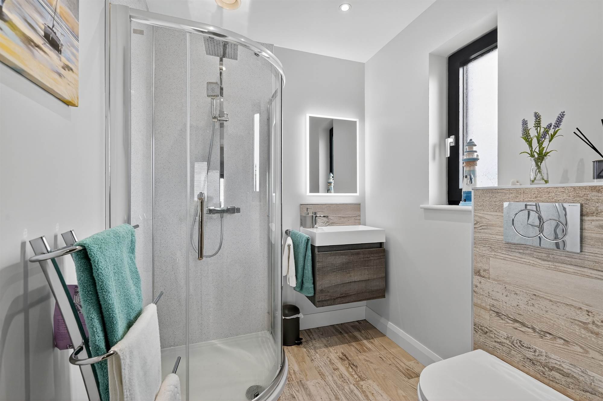Large double shower cubicle with pressurised shower unit, low flush wc, wash hand basin in vanity unit with drawers under, vanity mirror. Ceramic tiled floor, Double built-in robe.