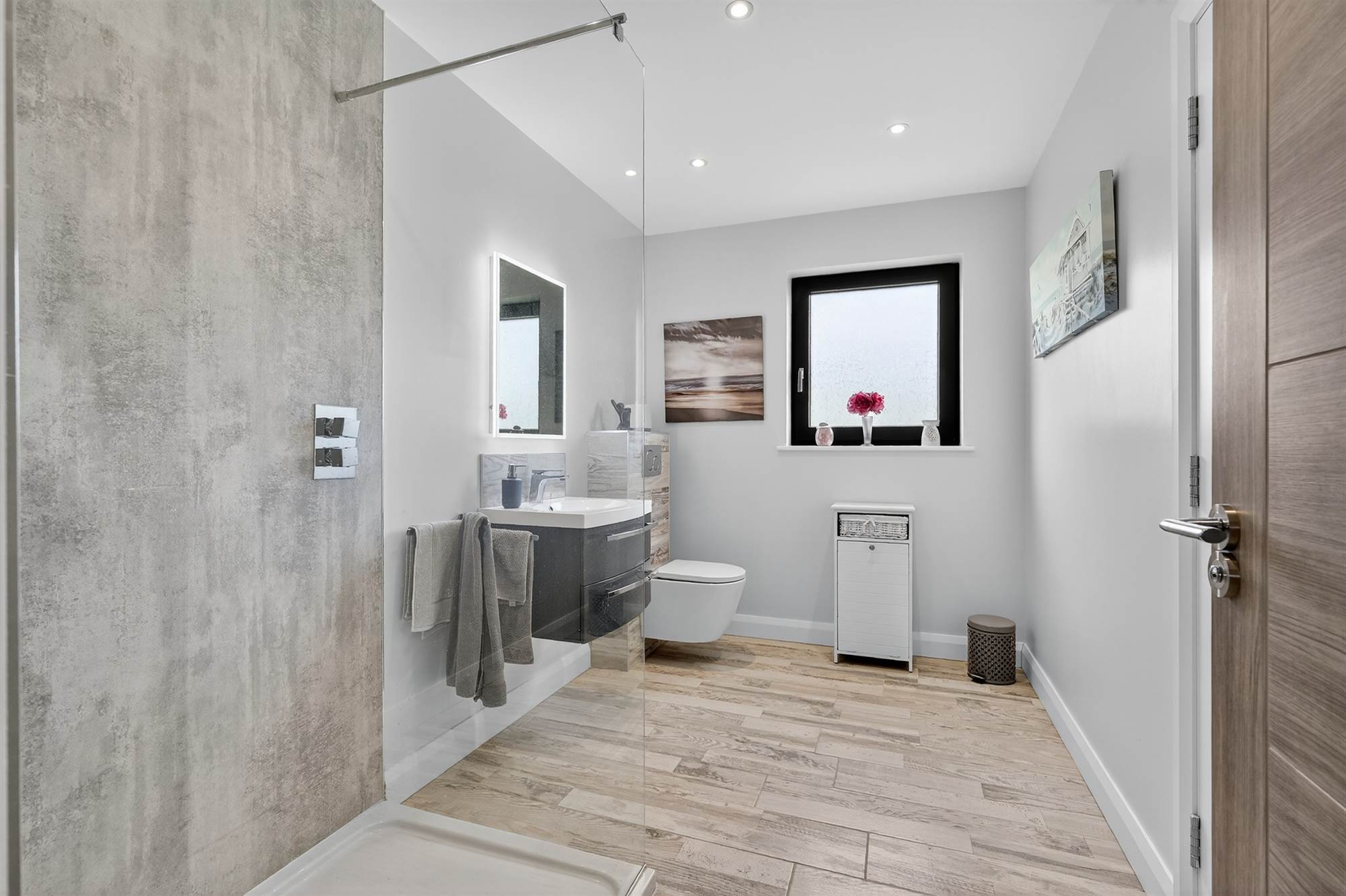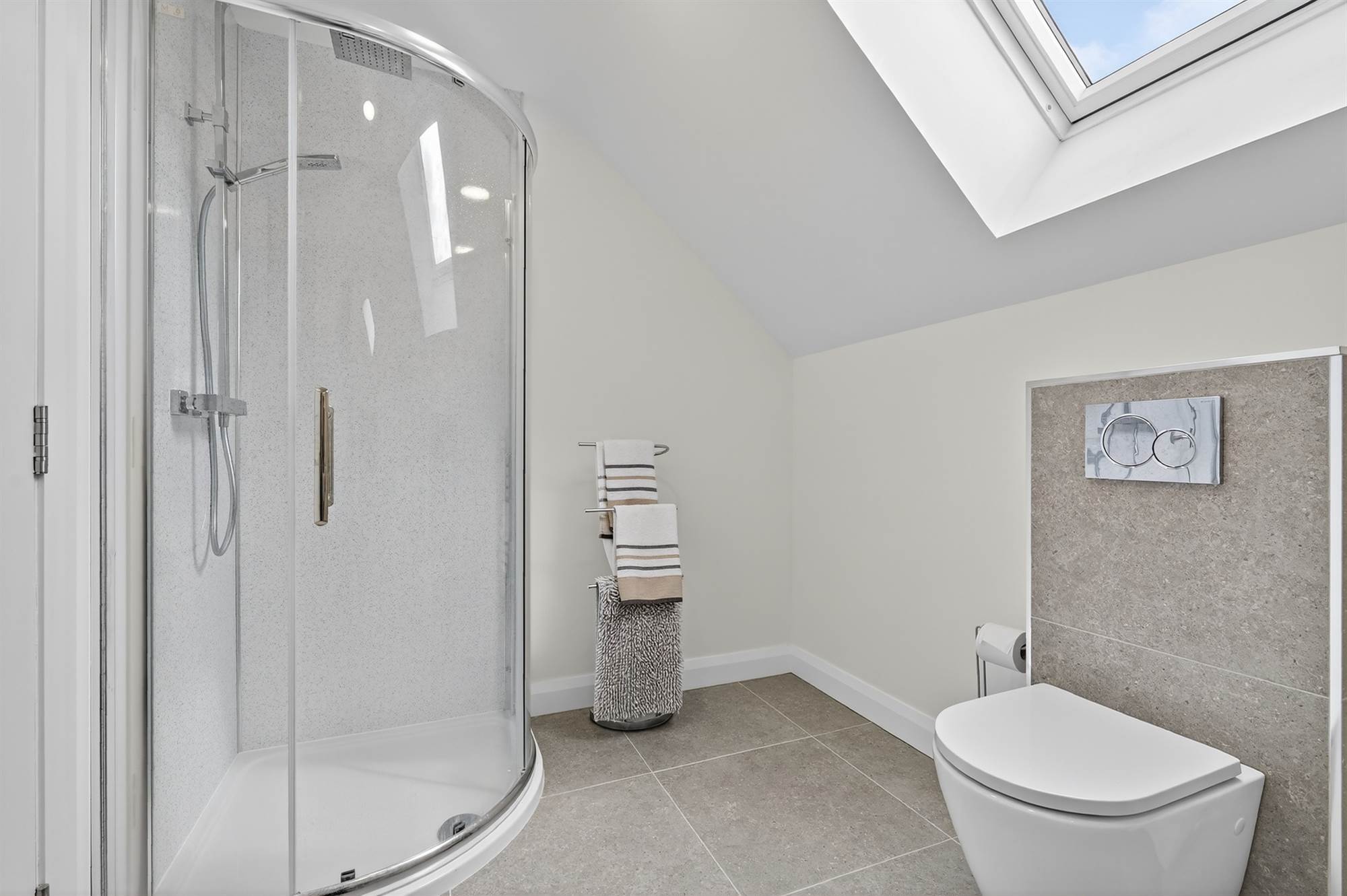 Family bathroom, double shower cubicle, wash hand basin in vanity unit, low flush wc.