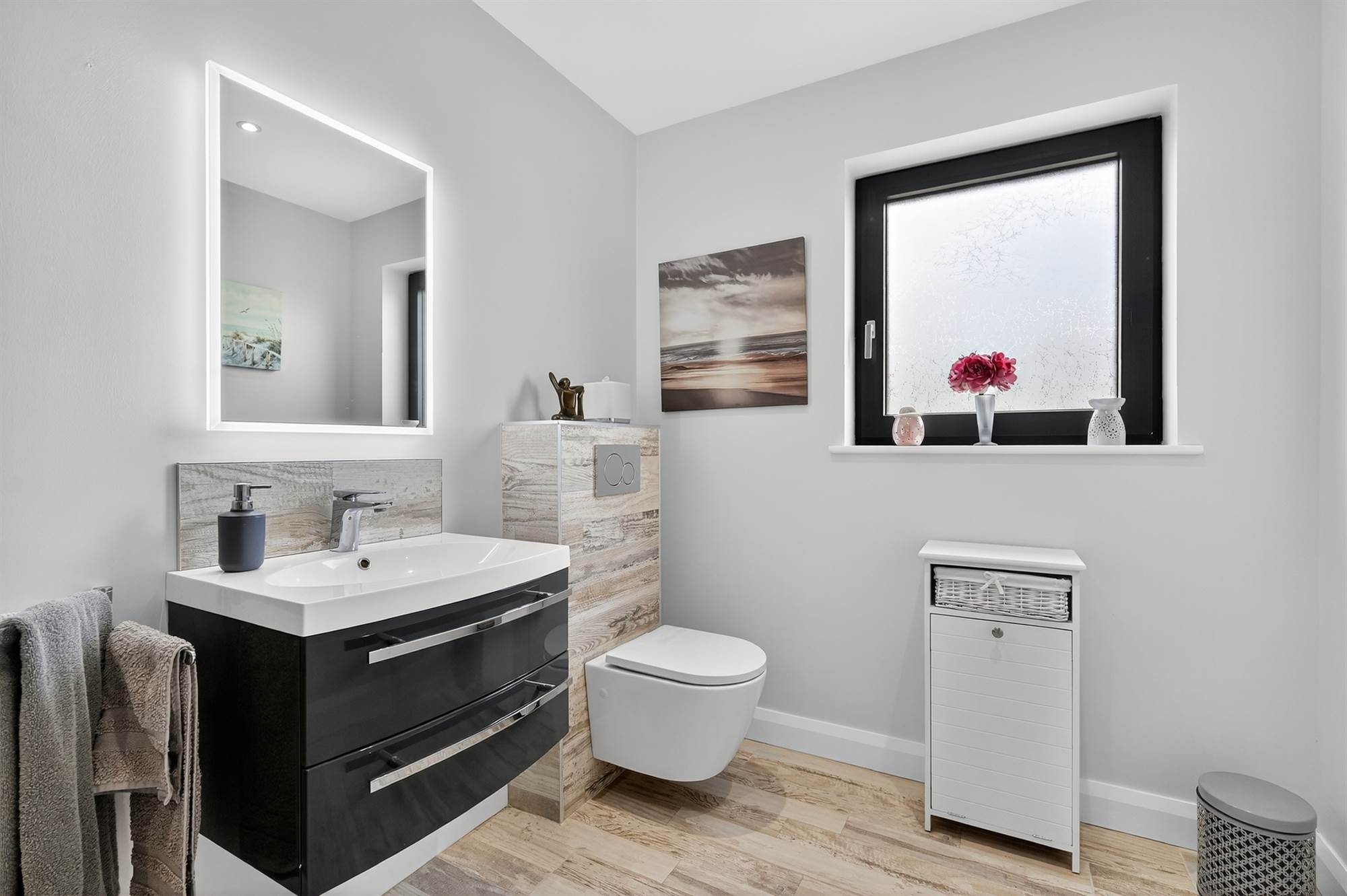 Wash hand basin in modern vanity unit with mirror, low flush wc.