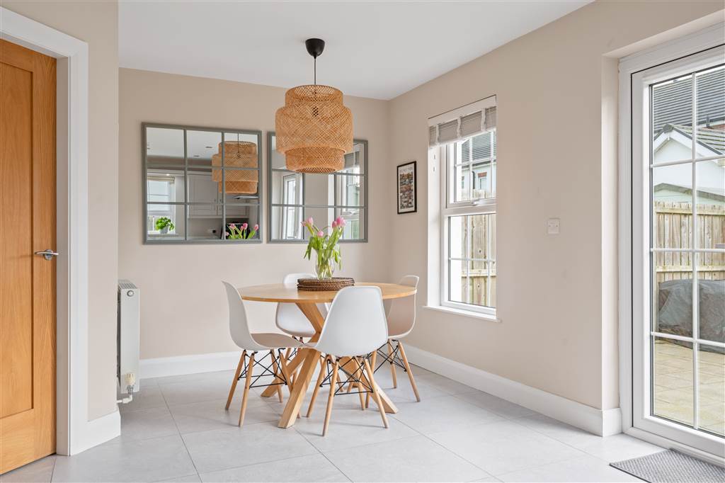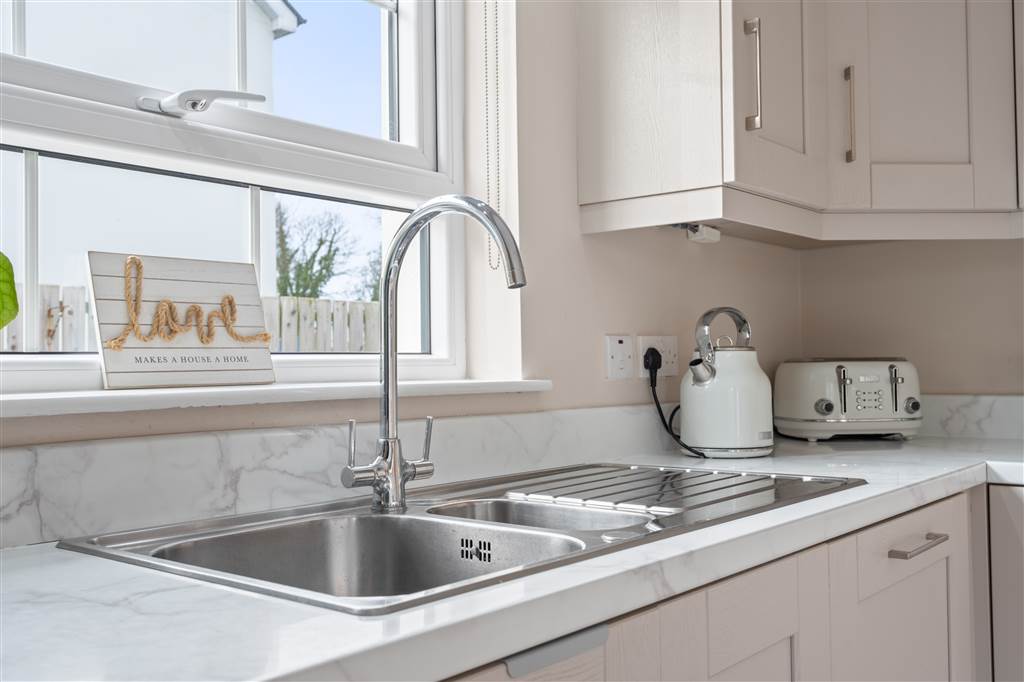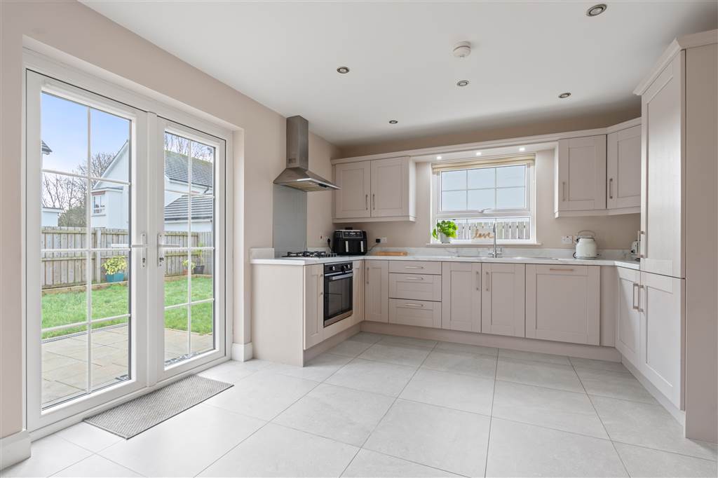 With a range of eye and low-level fitted units, 1 1/4 bowl stainless-steel sink unit and drainer with stainless-steel mixer tap. Integrated four ring gas hob with stainless-steel extractor fan over. Integrated electric oven. Integrated fridge-freezer. Integrated dishwasher. Cutlery drawer. Saucepan drawers. Spacious area for dining. Spot lighting to ceiling. Tiled flooring. PVC double doors to rear.